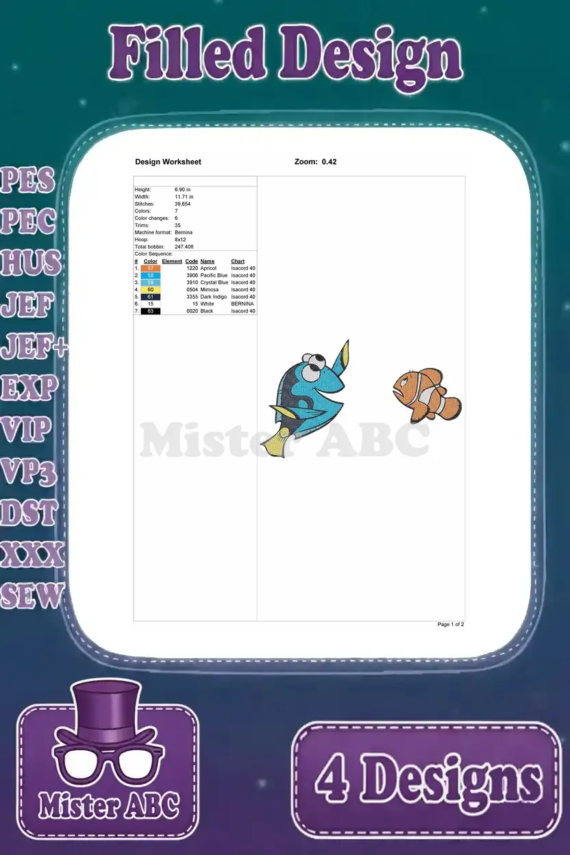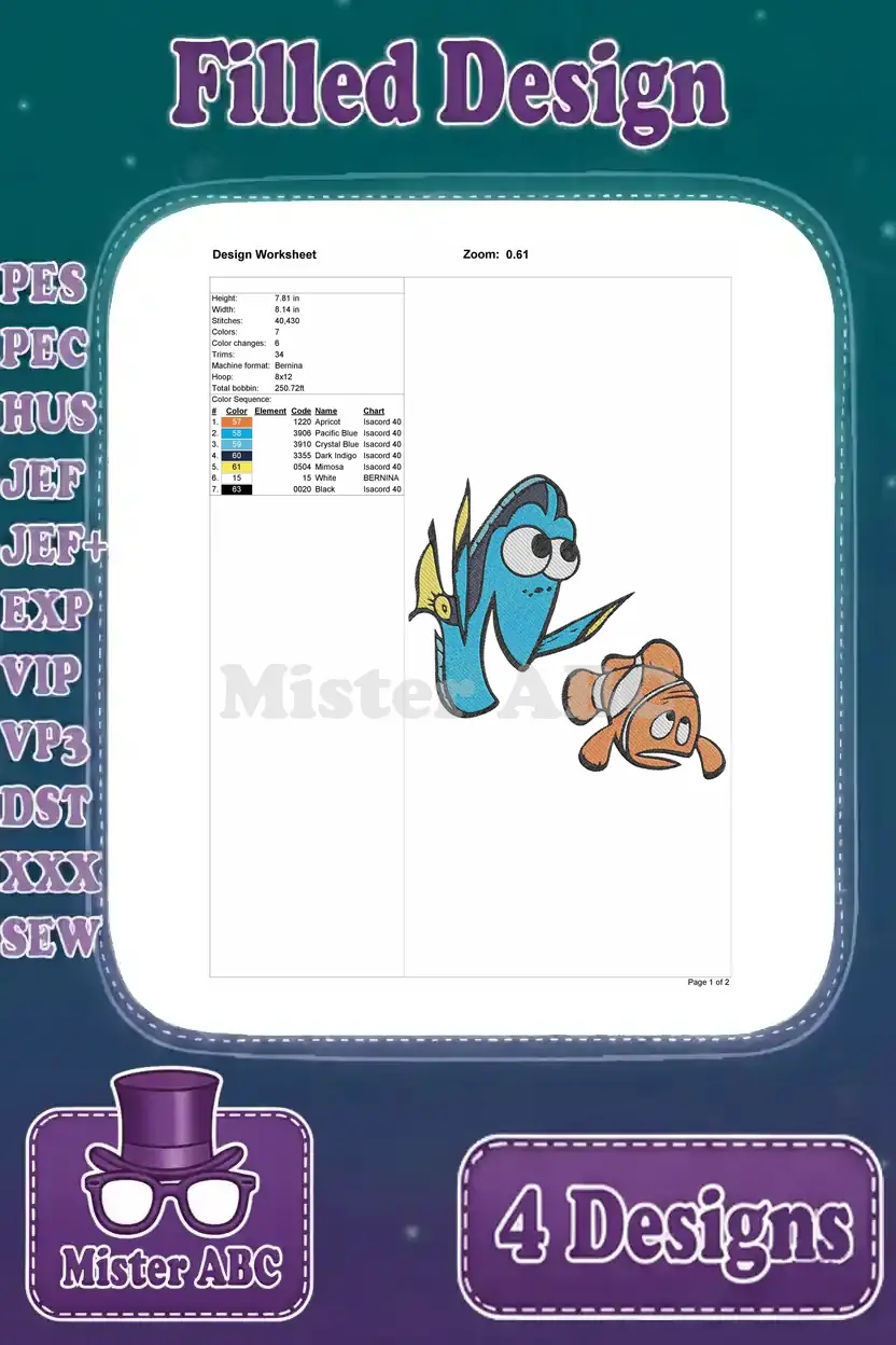 Dive into the ocean with this charming 4-design embroidery bundle featuring beloved Finding Nemo and Dory characters. Perfect for adding a splash of undersea fun to any project.