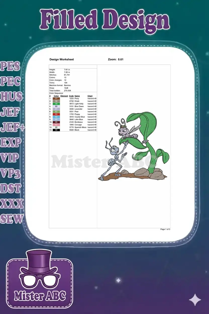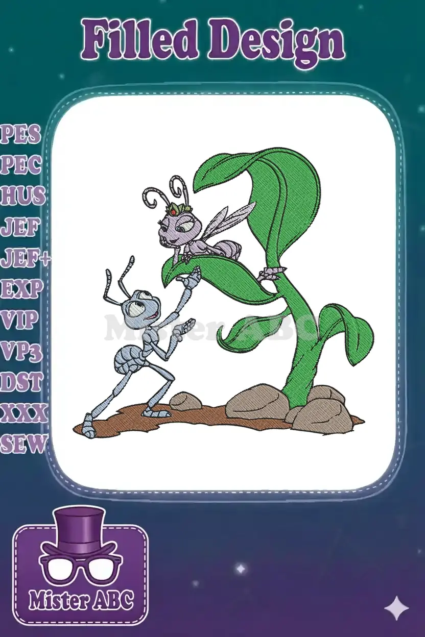 Disney Pixar Flik and Princess Atta on leaf embroidery designs