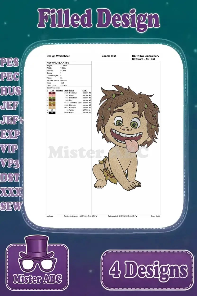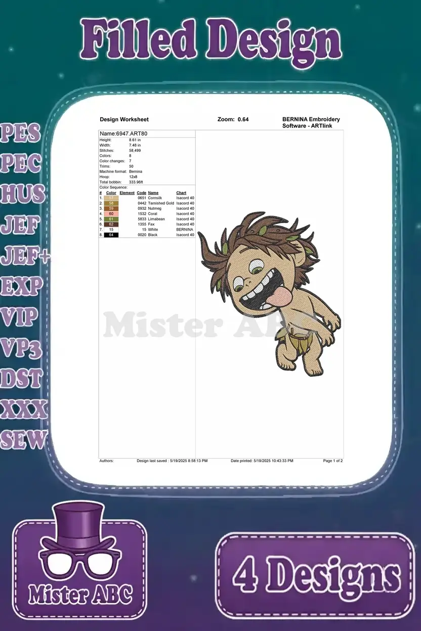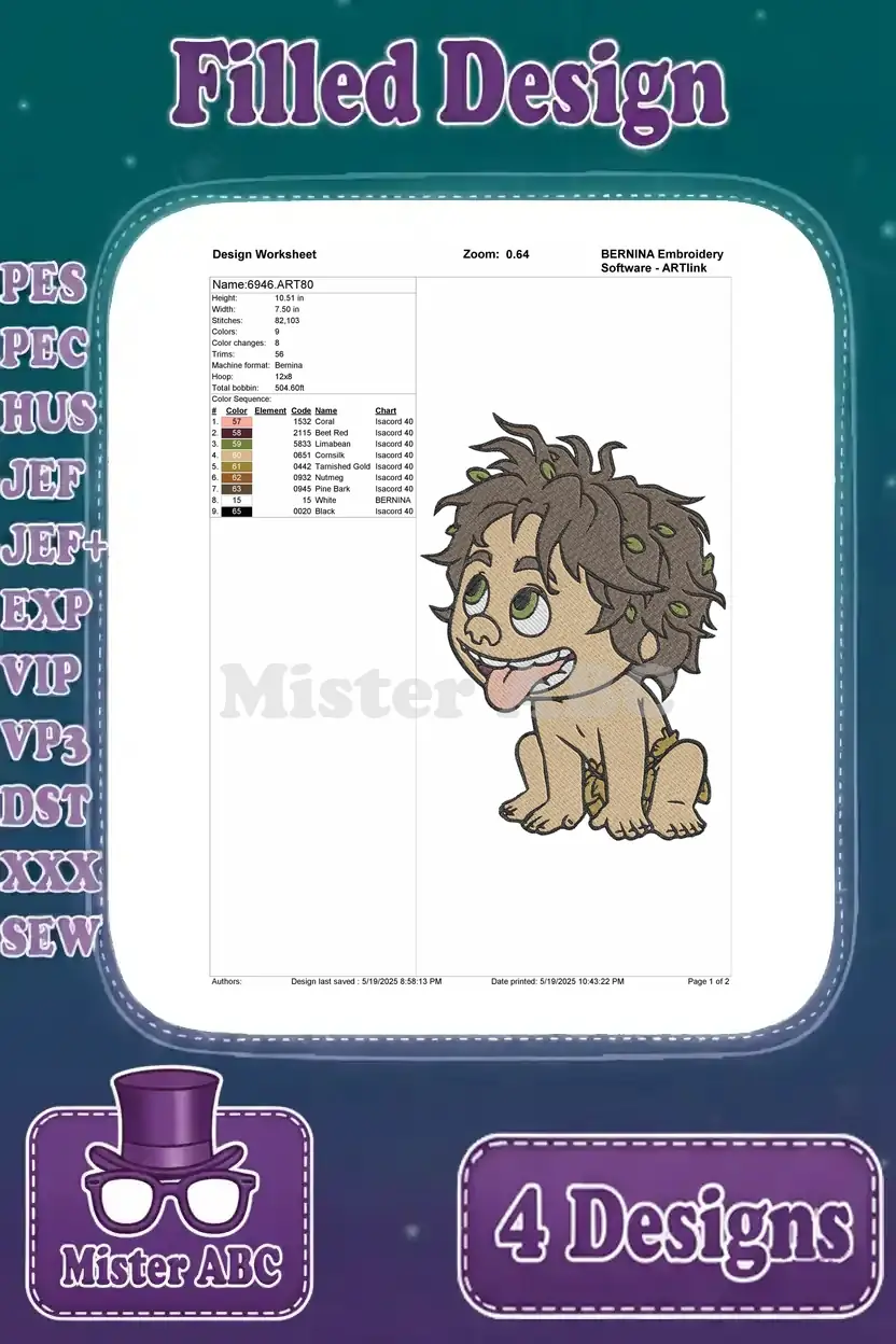 Disney Pixar Good Dinosaur Spot Human Boy Wild Child Running Happy Poses – Filled Embroidery Design
