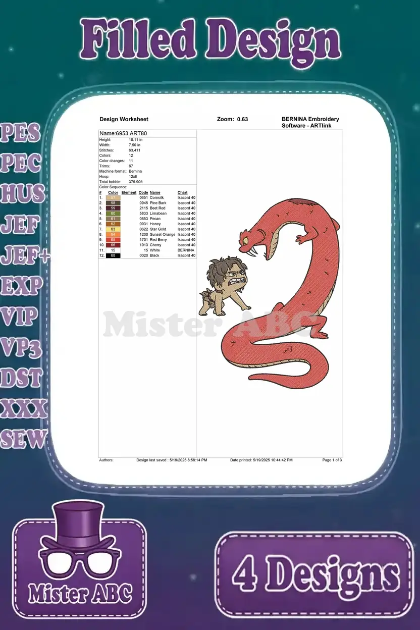 Disney Pixar Good Dinosaur Spot Human Boy Action Poses With Snake Brave Set – Filled Embroidery Design