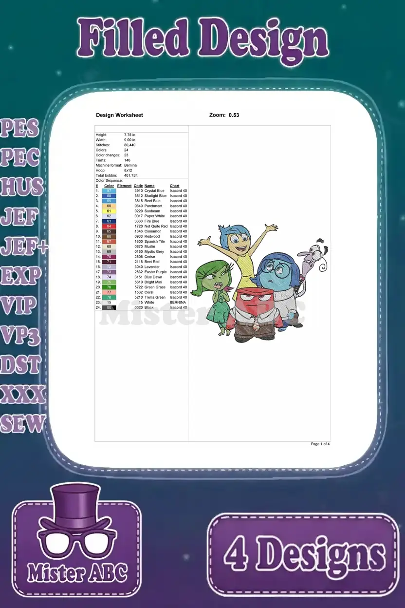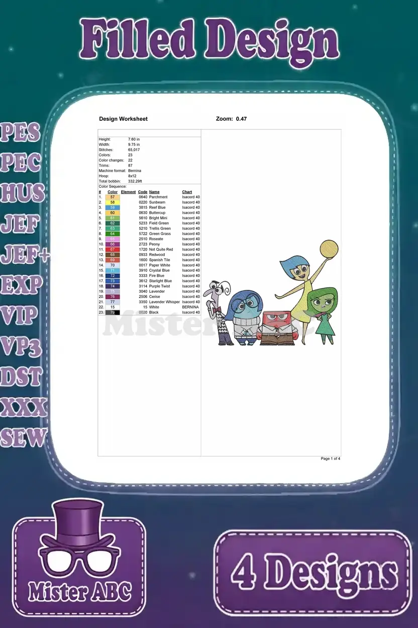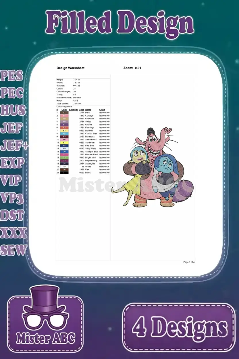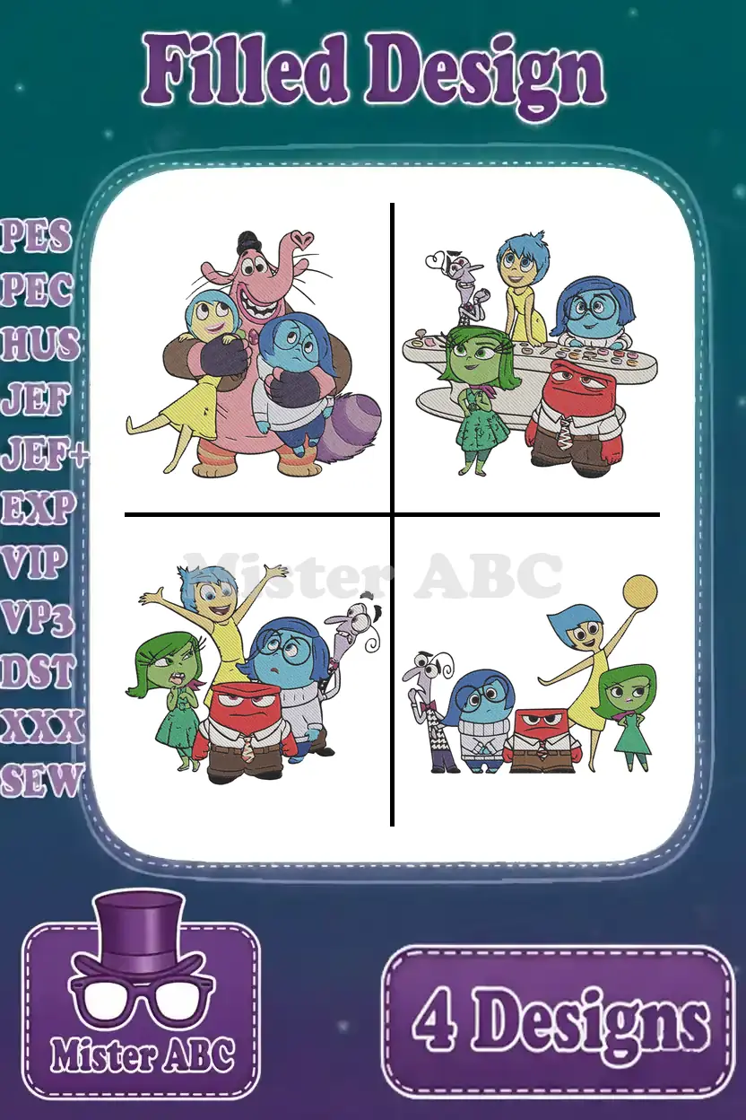 A vibrant bundle of four filled embroidery designs featuring beloved Inside Out characters for your projects!