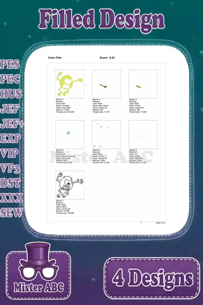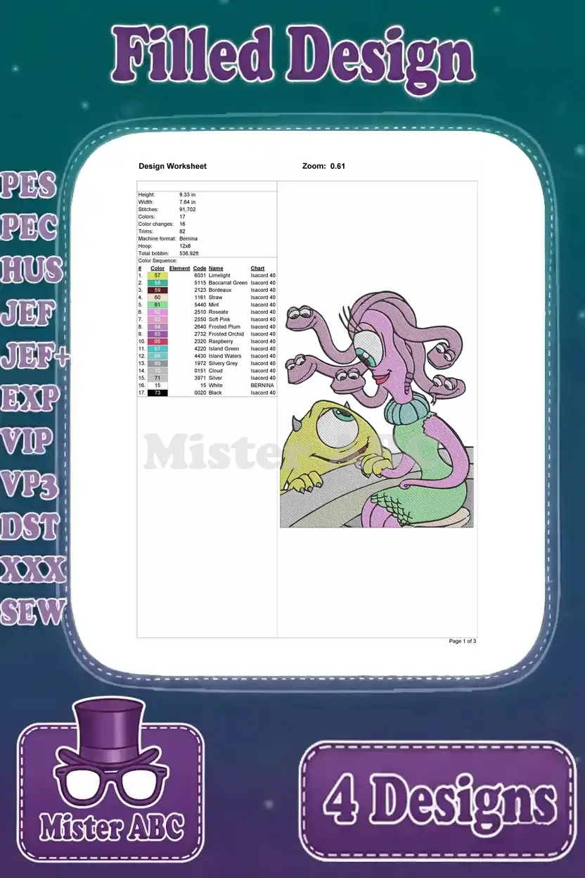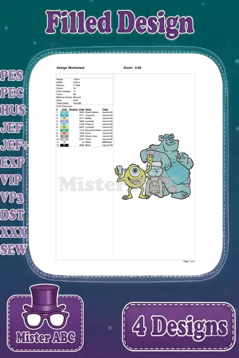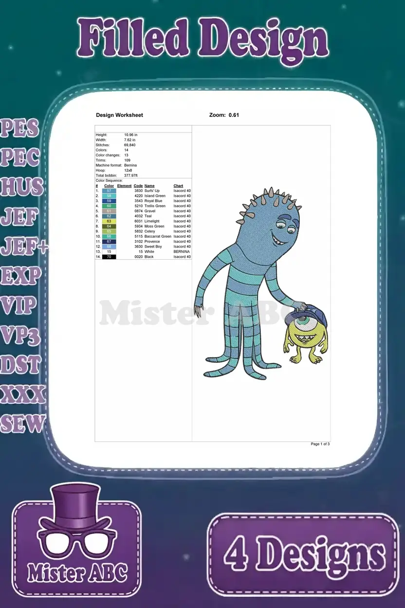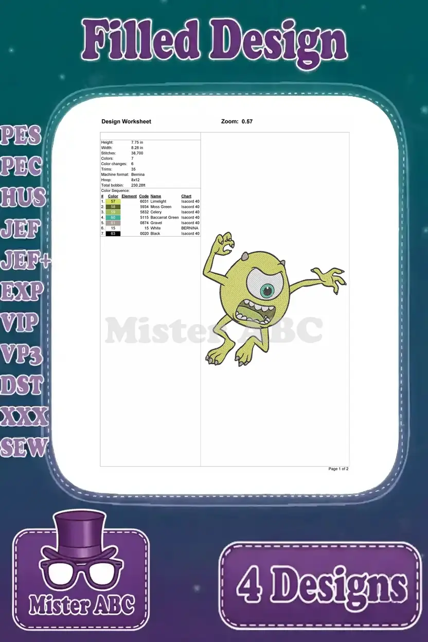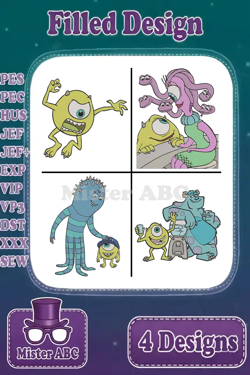 Disney Pixar Monsters Characters Mike Celia Mae Squishys Mom Sulley Assorted Collection – Filled Embroidery Design