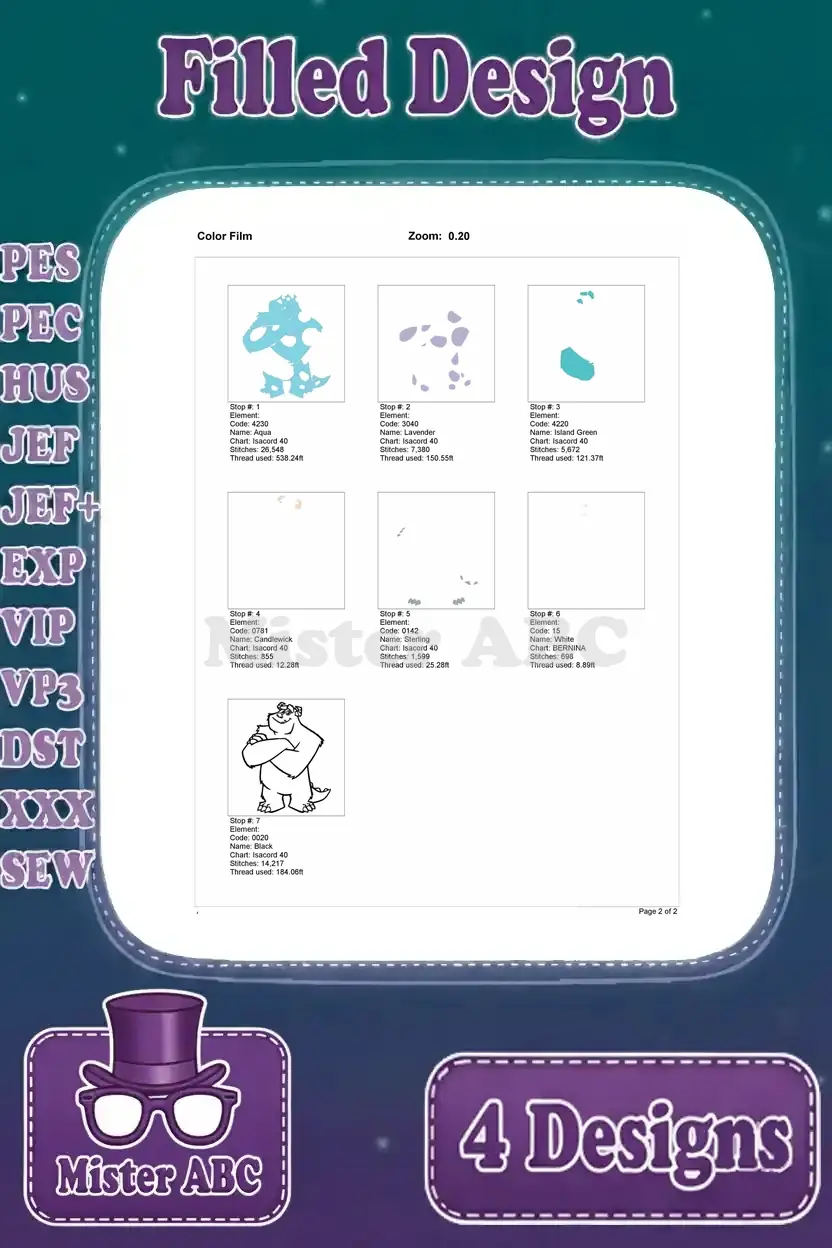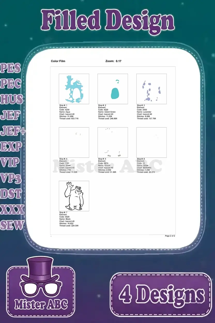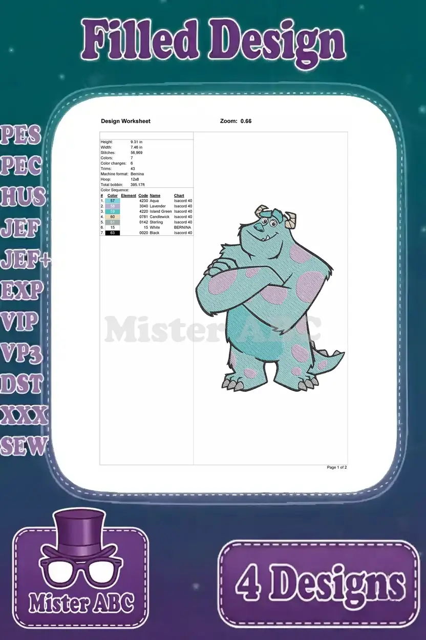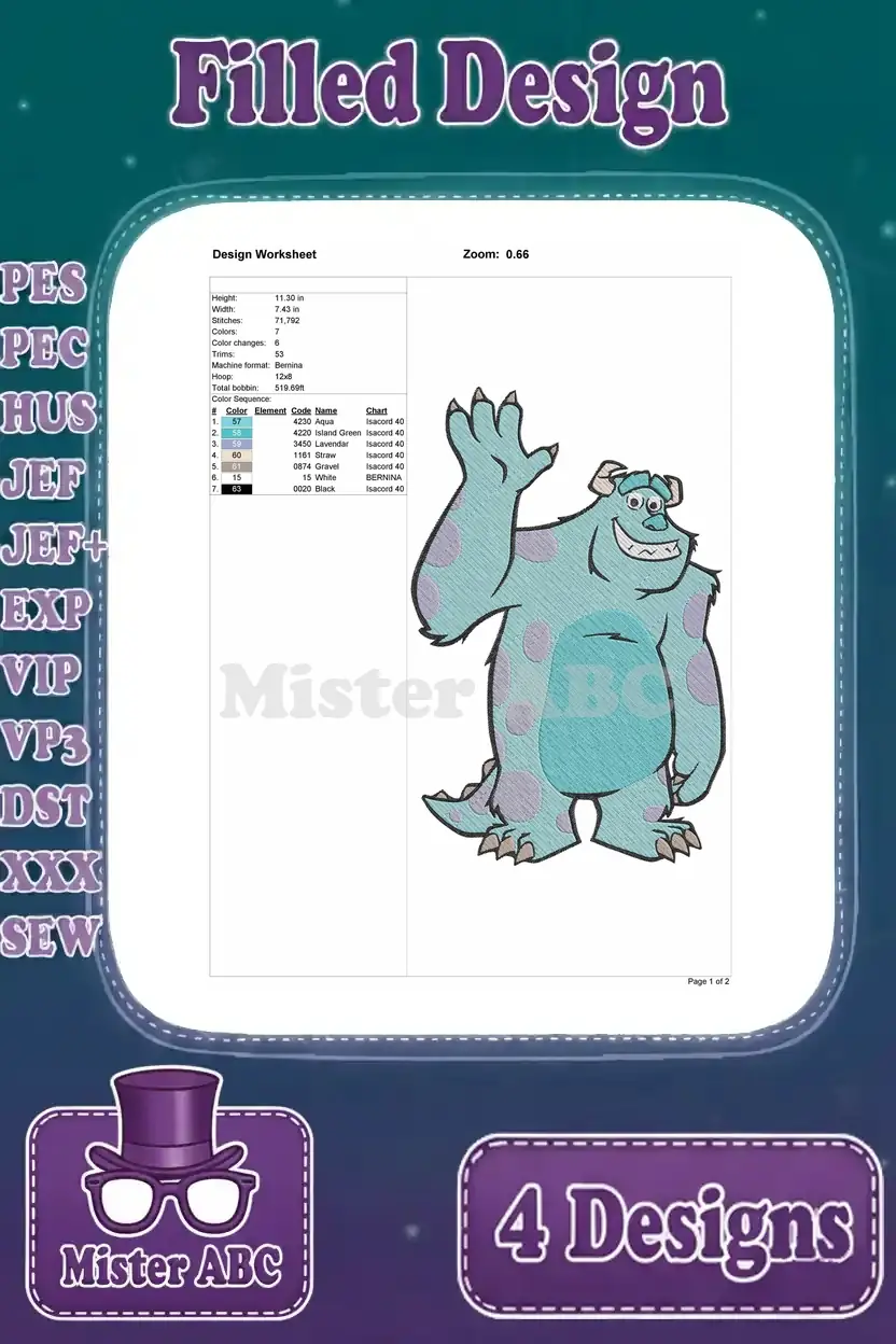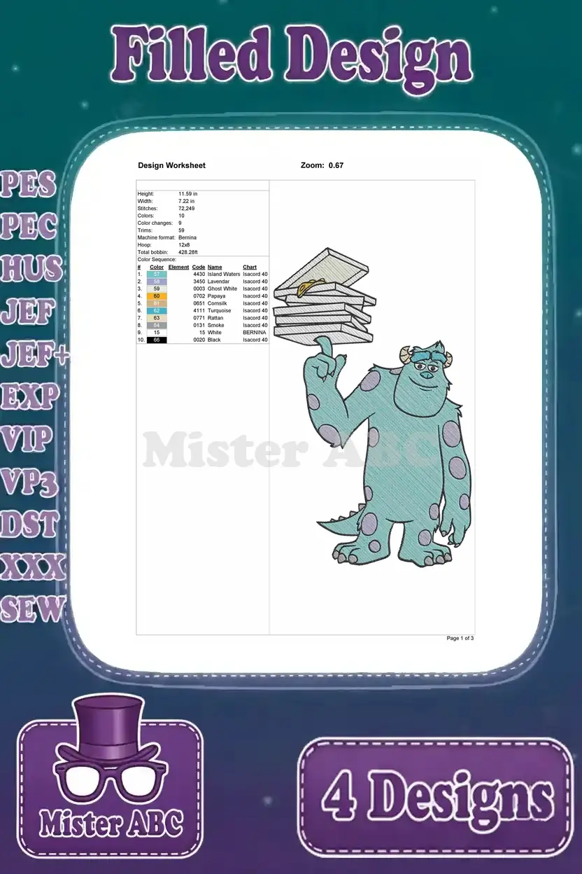 Disney Pixar Monsters Inc Henry Waternoose Ceo Sulley Sullivan Scaring Papers Blue Monster Set – Filled Embroidery Design