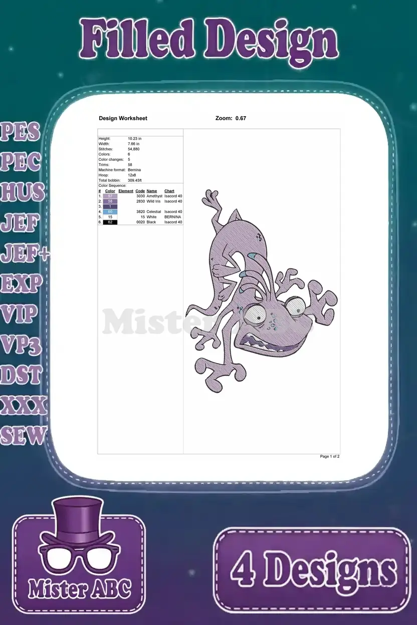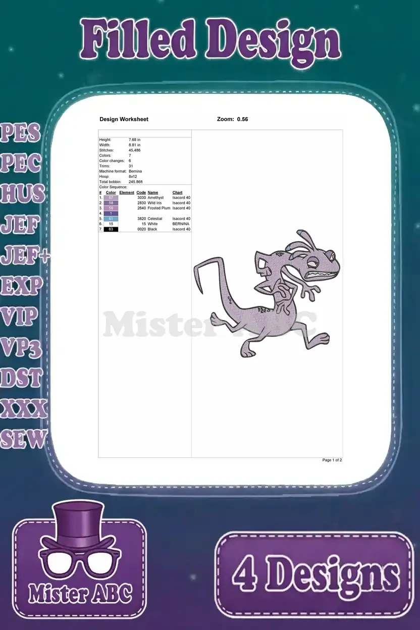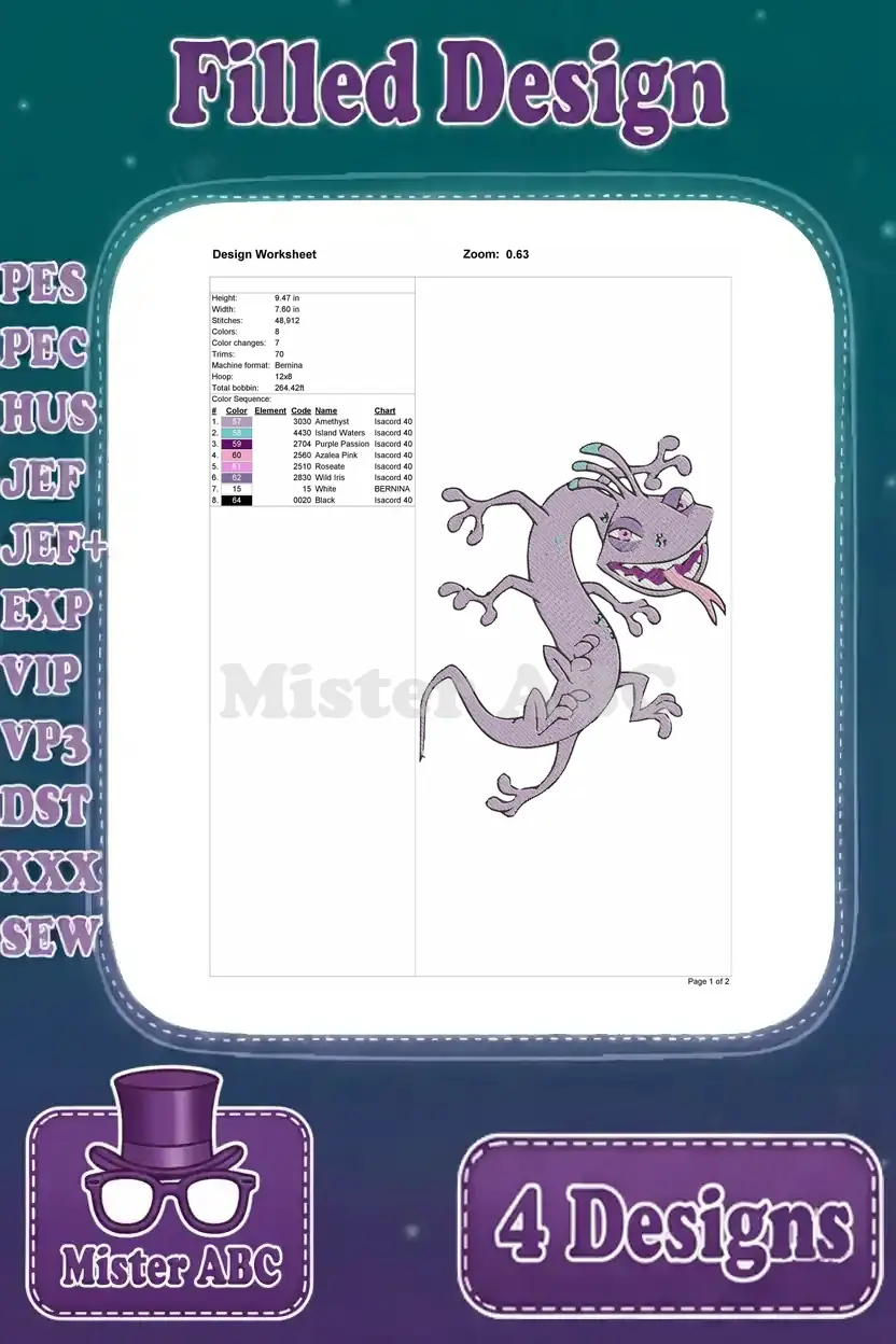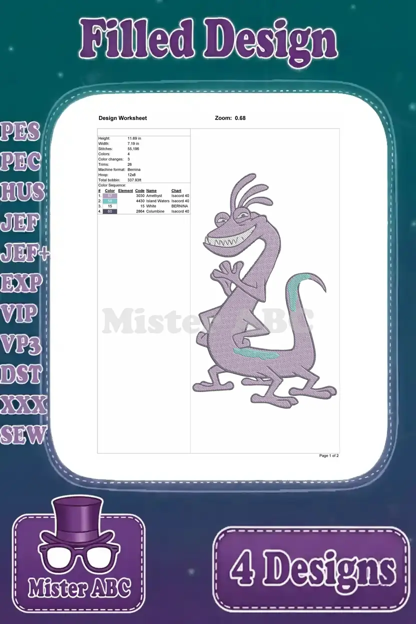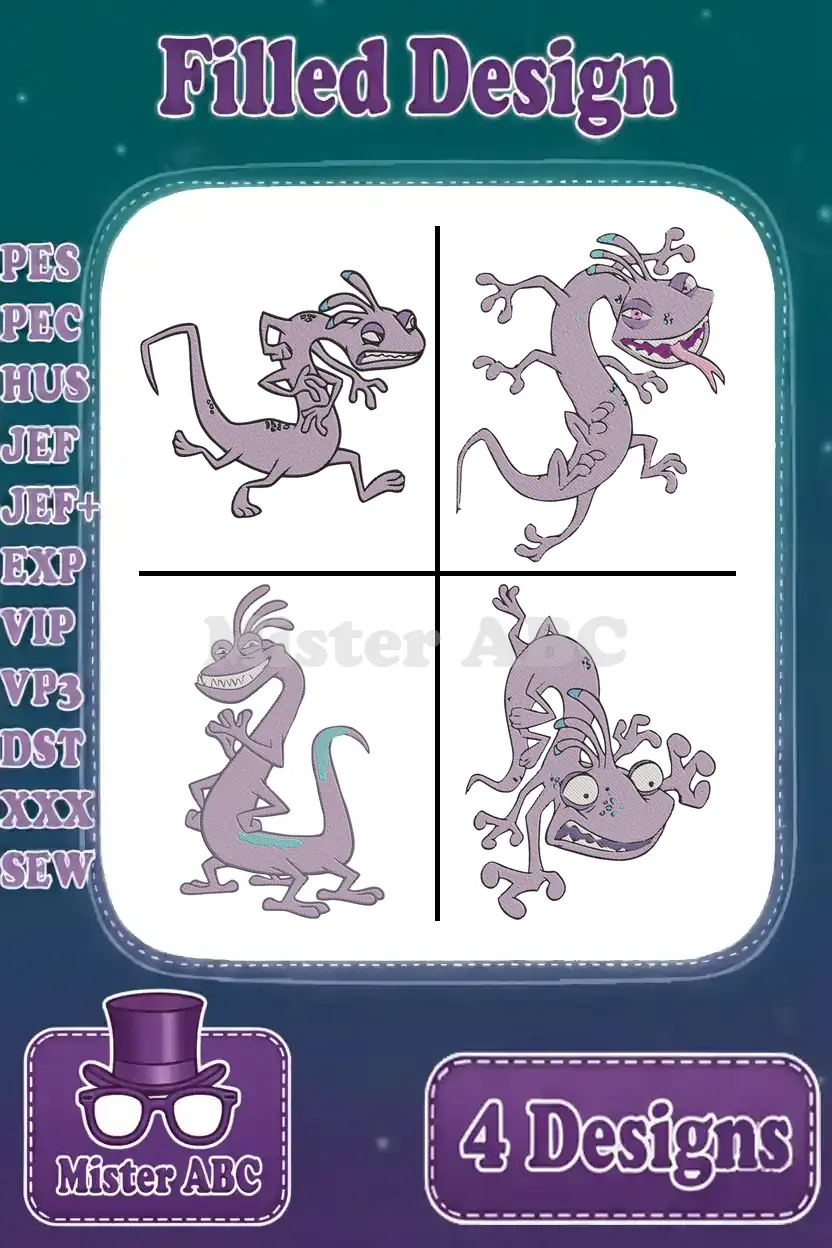 Disney Pixar Monsters Inc University Randall Boggs Lizard Monster Various Poses Collection – Filled Embroidery Design