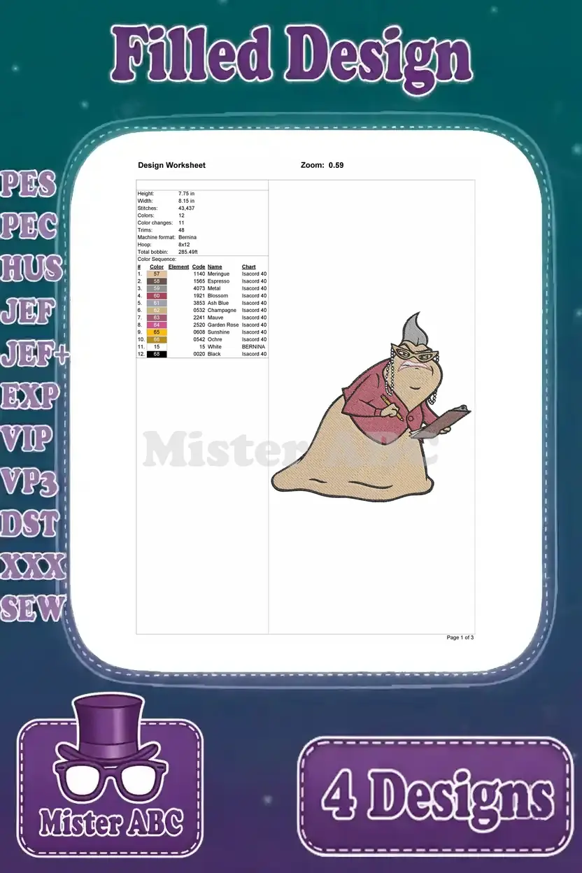 Disney Pixar Monsters University Dean Hardscrabble Mrs Graves Sheri Squibbles Faculty - Filled Embroidery Design - 4080