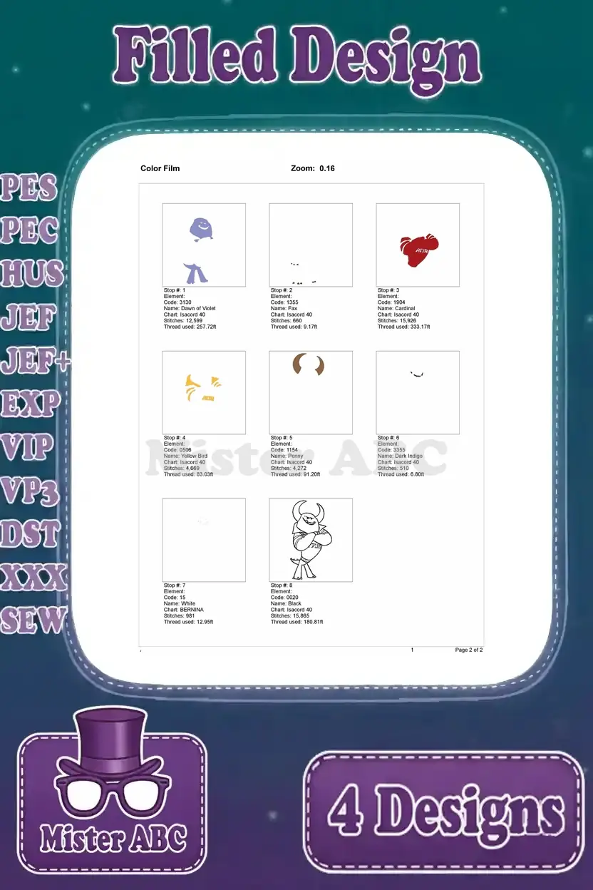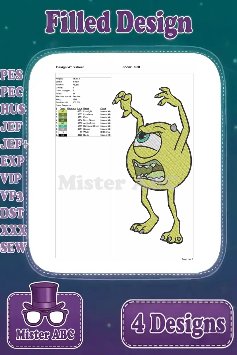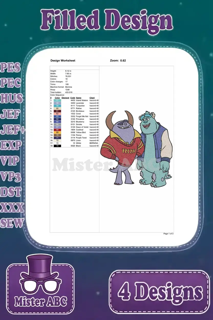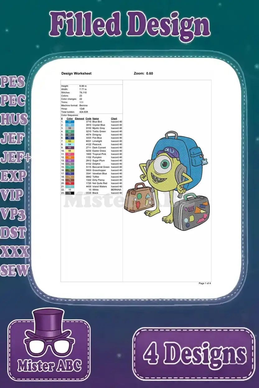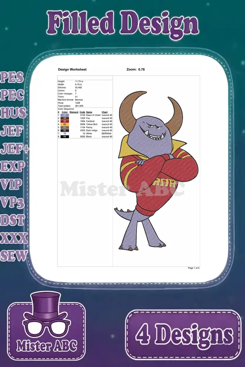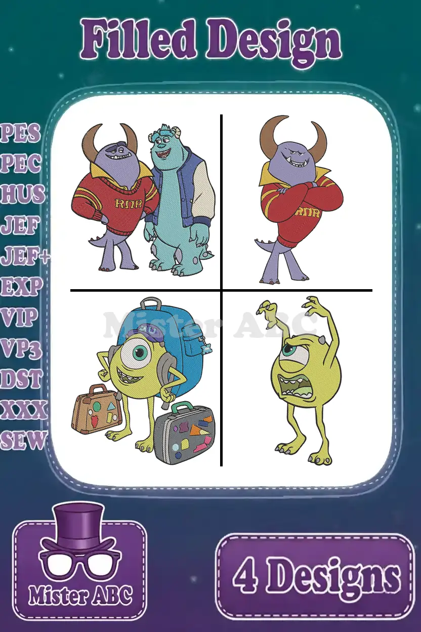 Disney Pixar Monsters University Sulley Ror Jacket Mike Hat Suitcase Randall Boggs Designs – Filled Embroidery Design