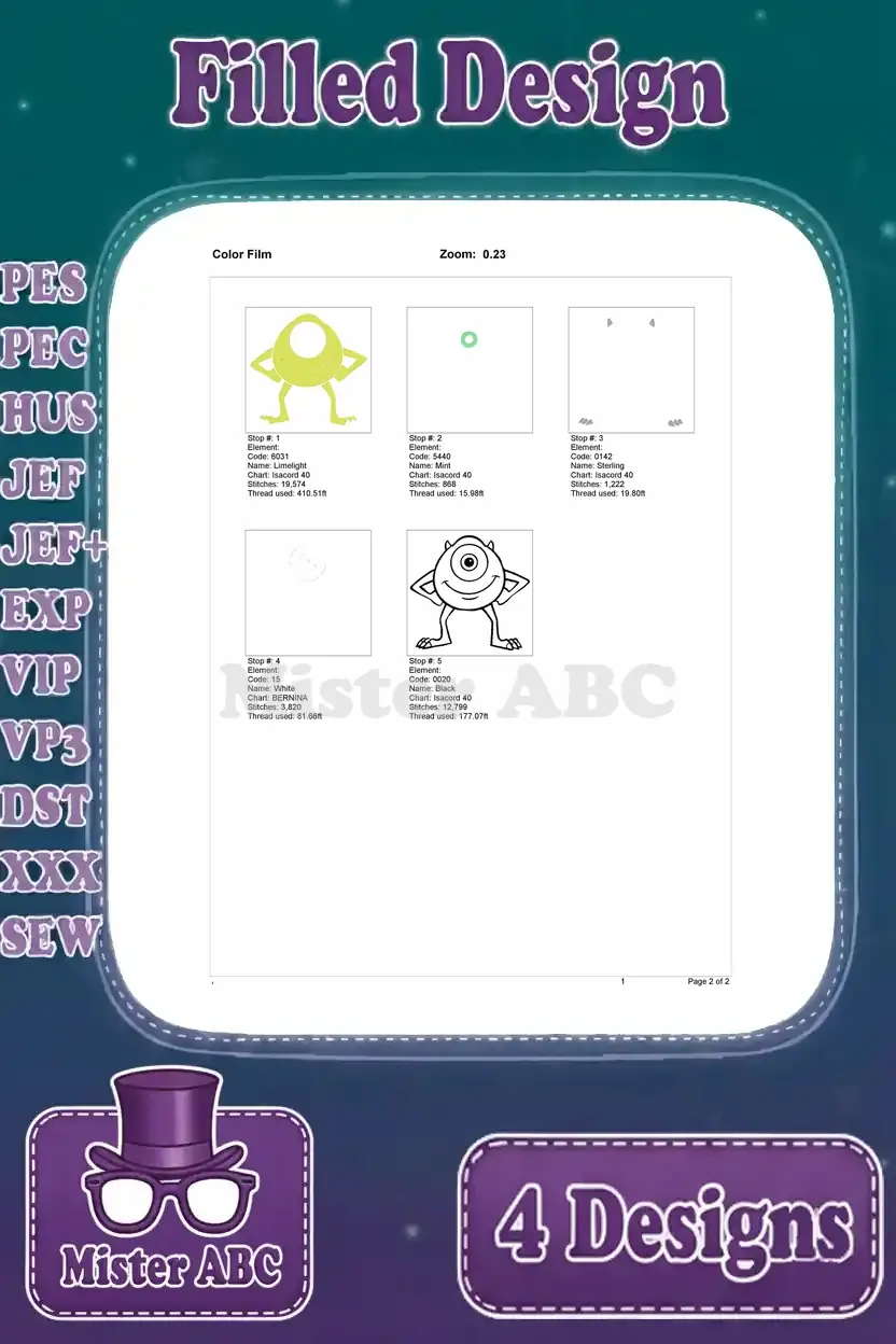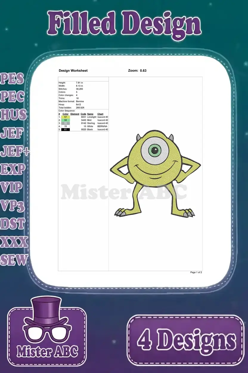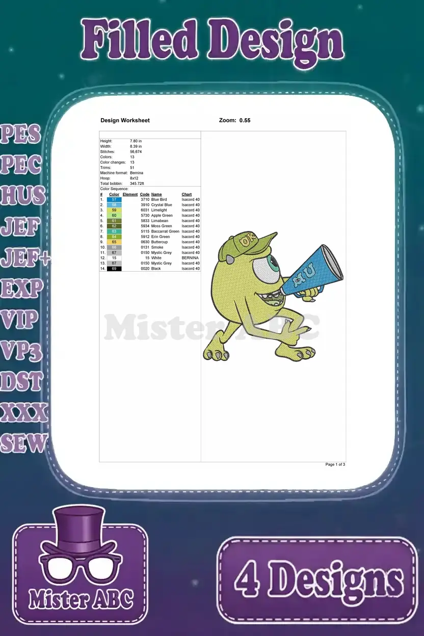 Disney Pixar Monsters University Mike Wazowski Mu Hat Megaphone Books Student Bundle – Filled Embroidery Design