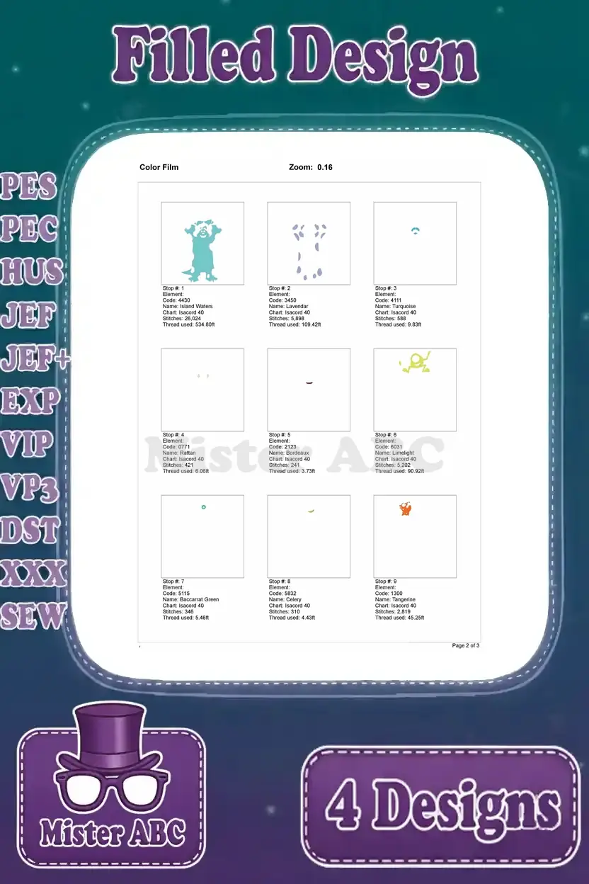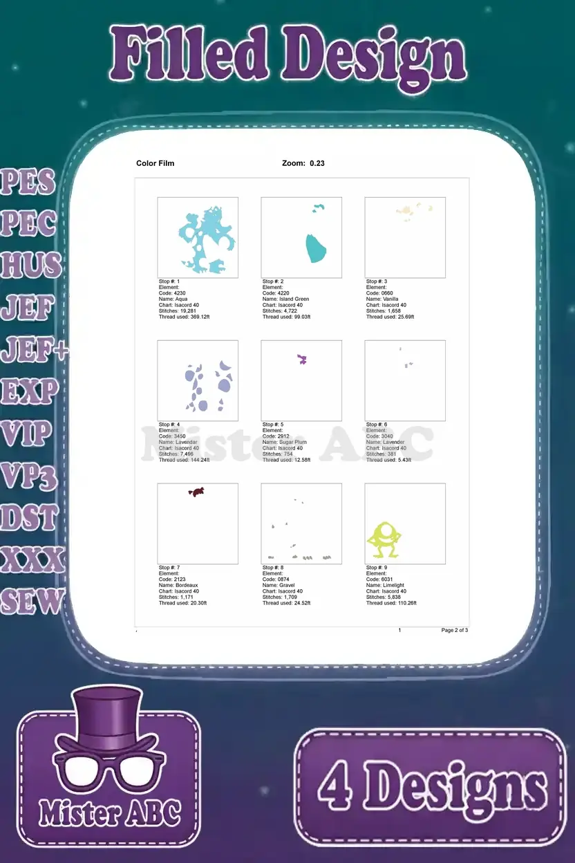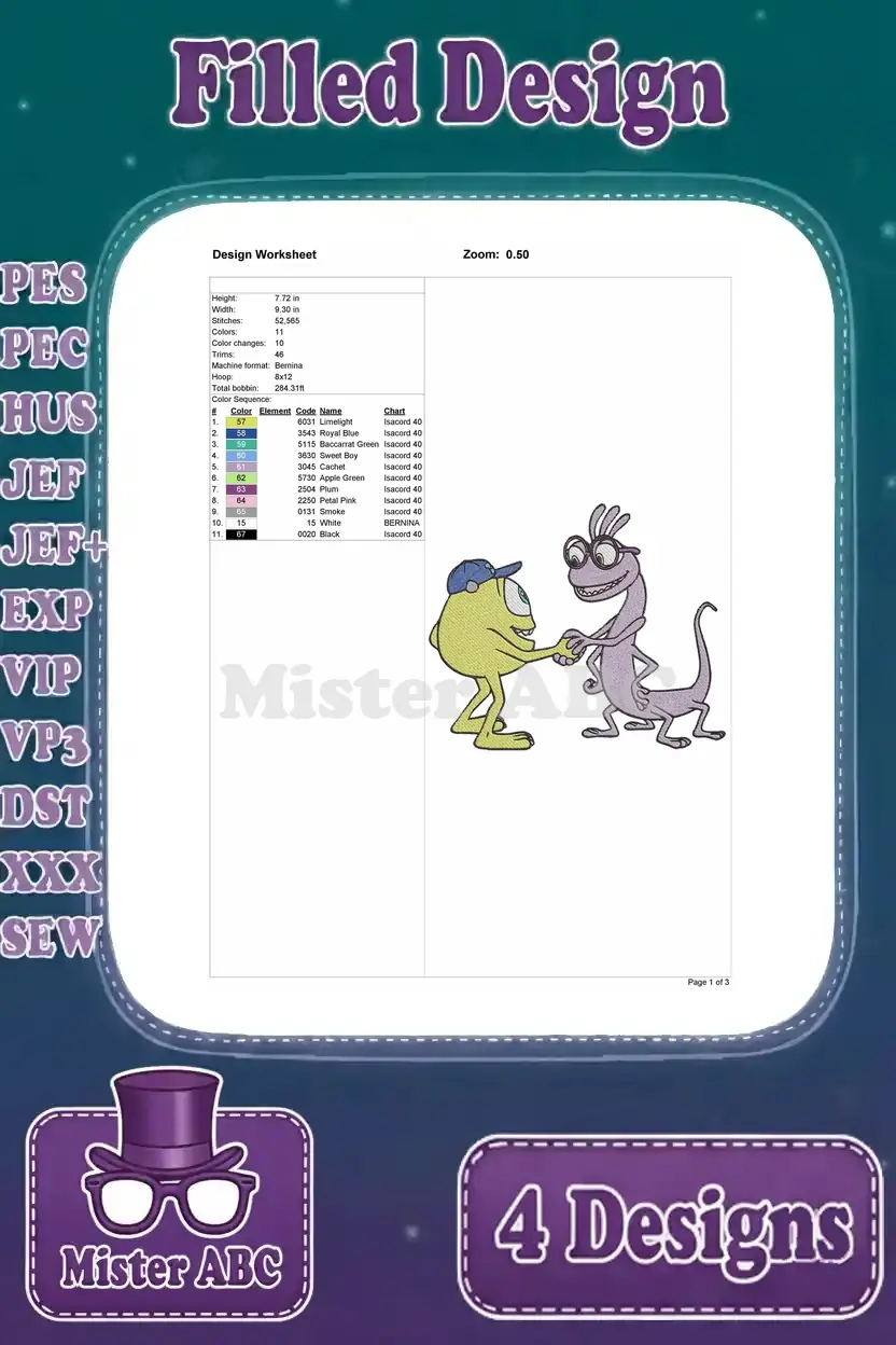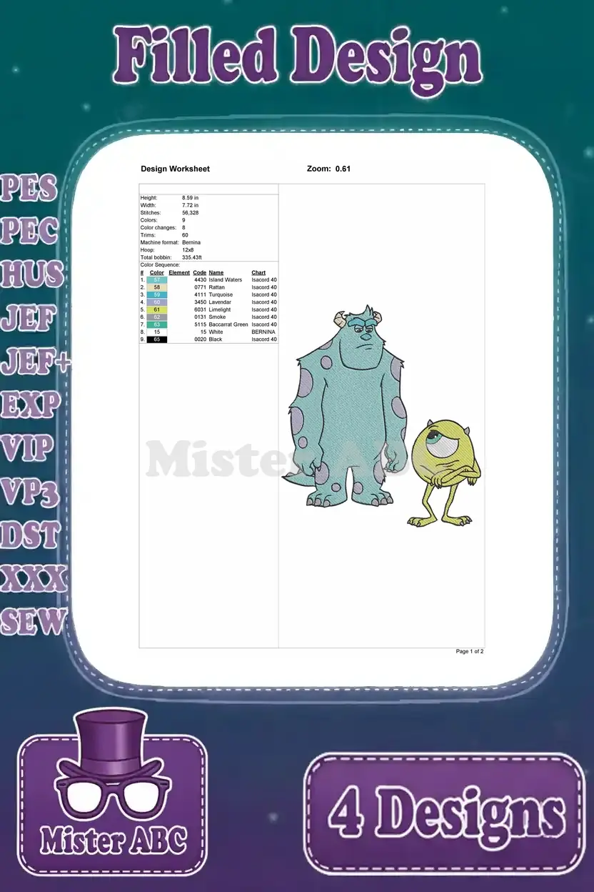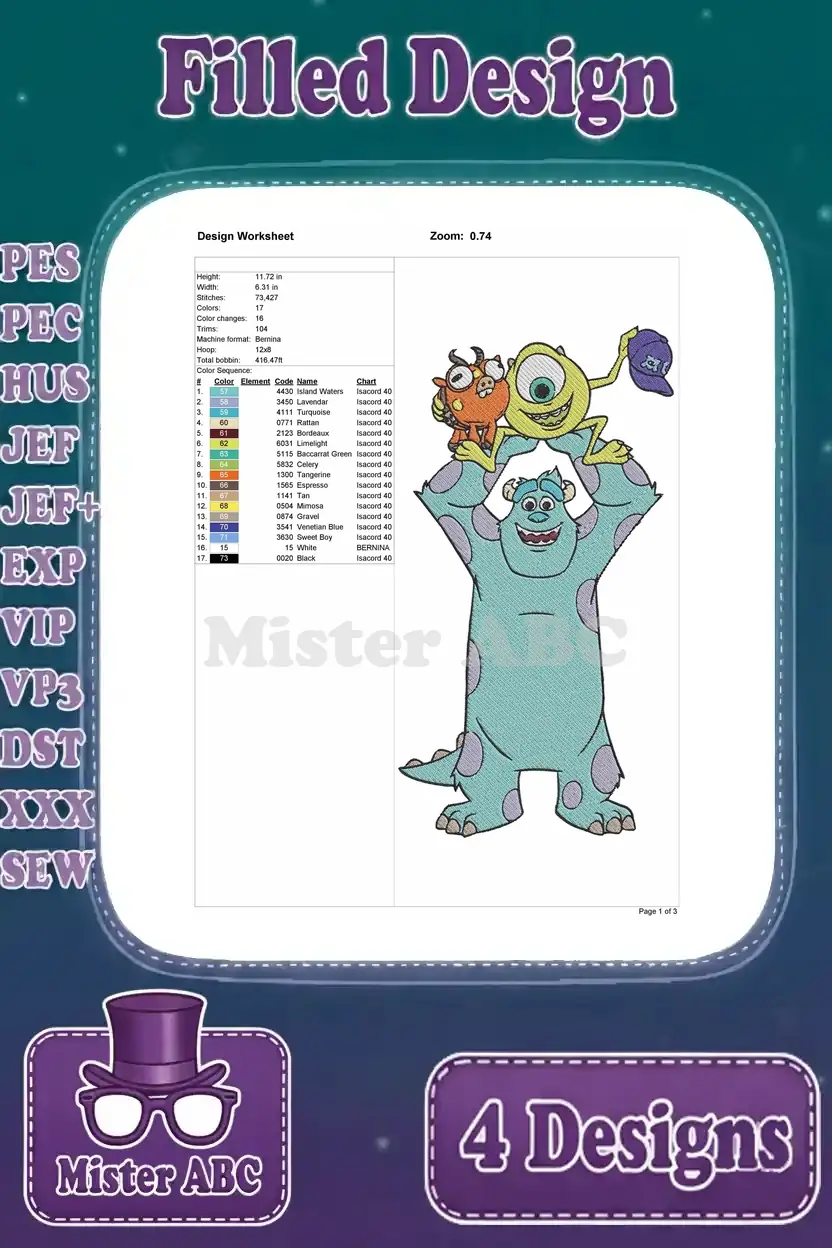 Discover a delightful Monsters Inc. embroidery bundle! Four filled designs featuring Sully, Mike, Boo, and Randall. Perfect for fans.