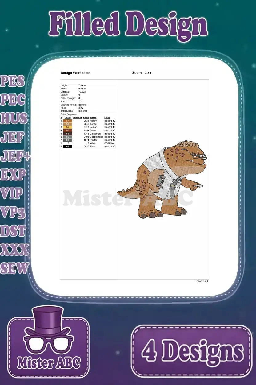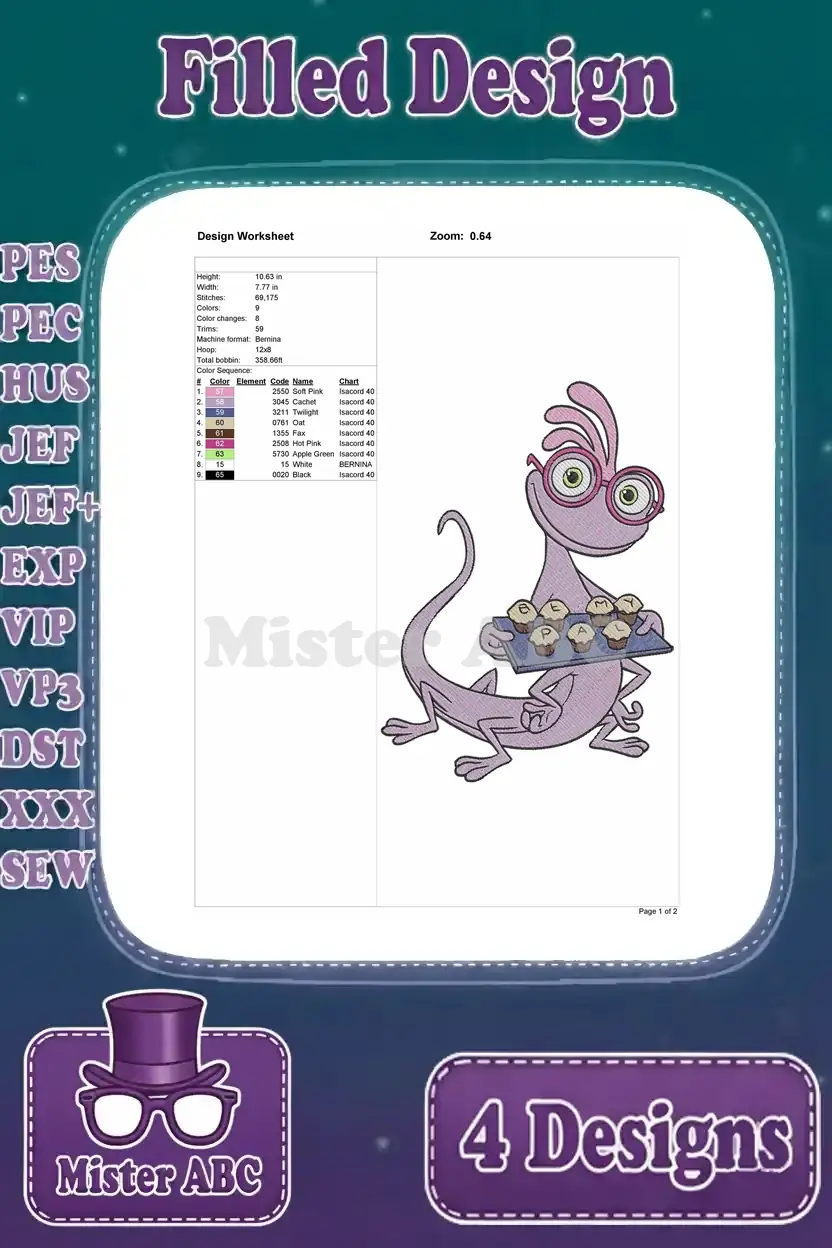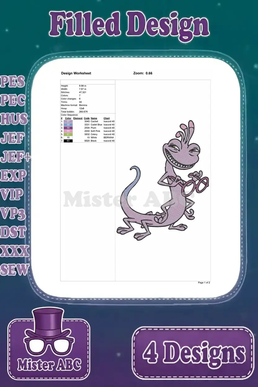 Disney Pixar Monsters University Terri Terry Perry Randall Boggs Student Monsters Set – Filled Embroidery Design