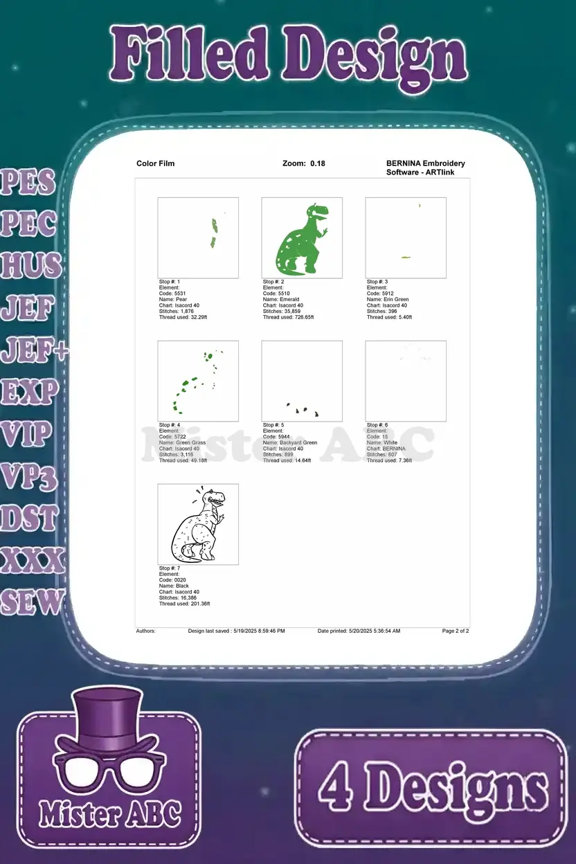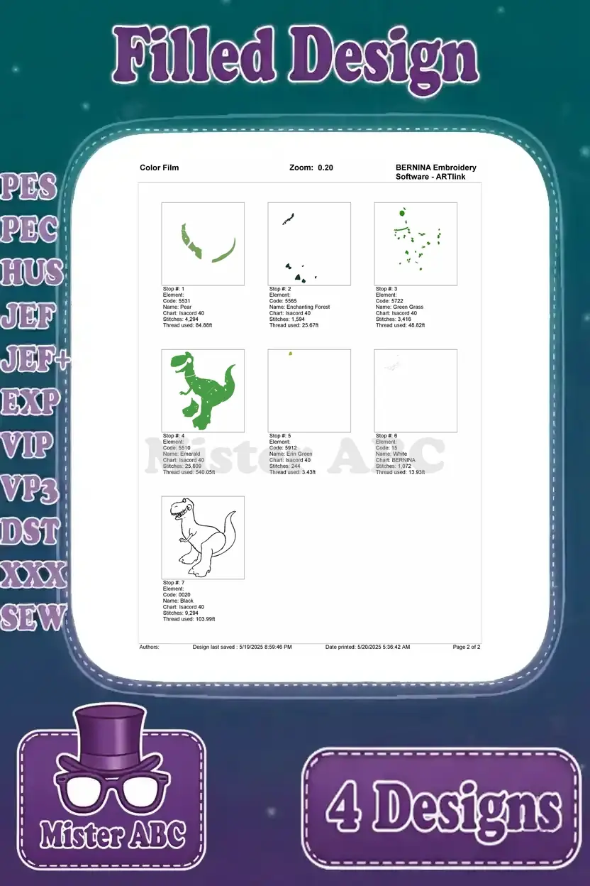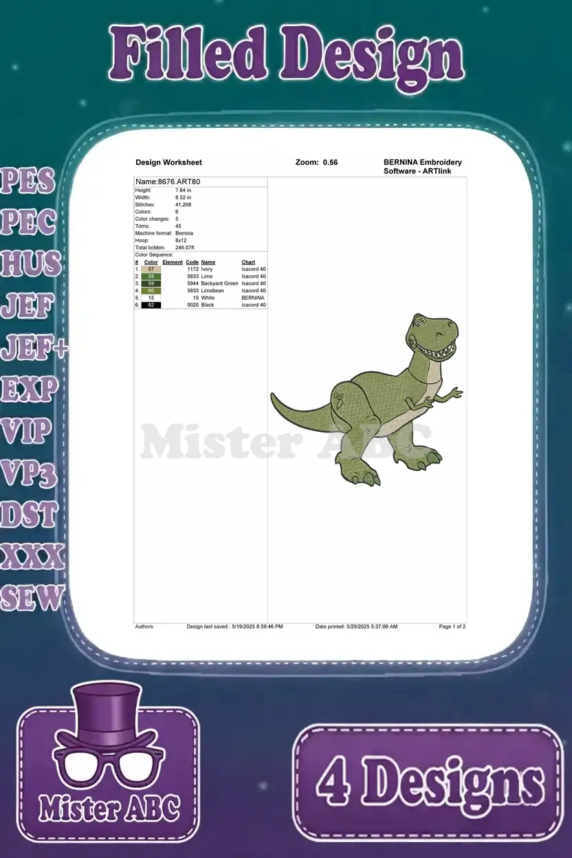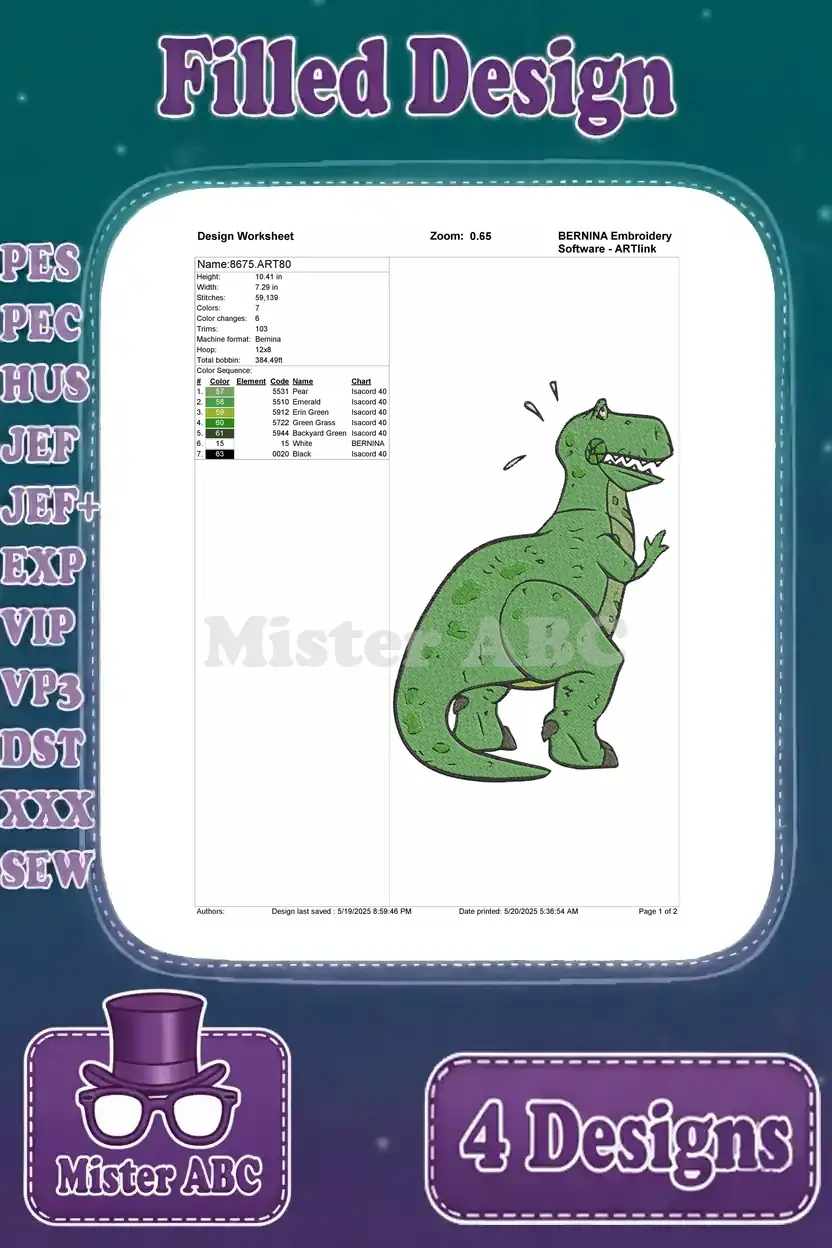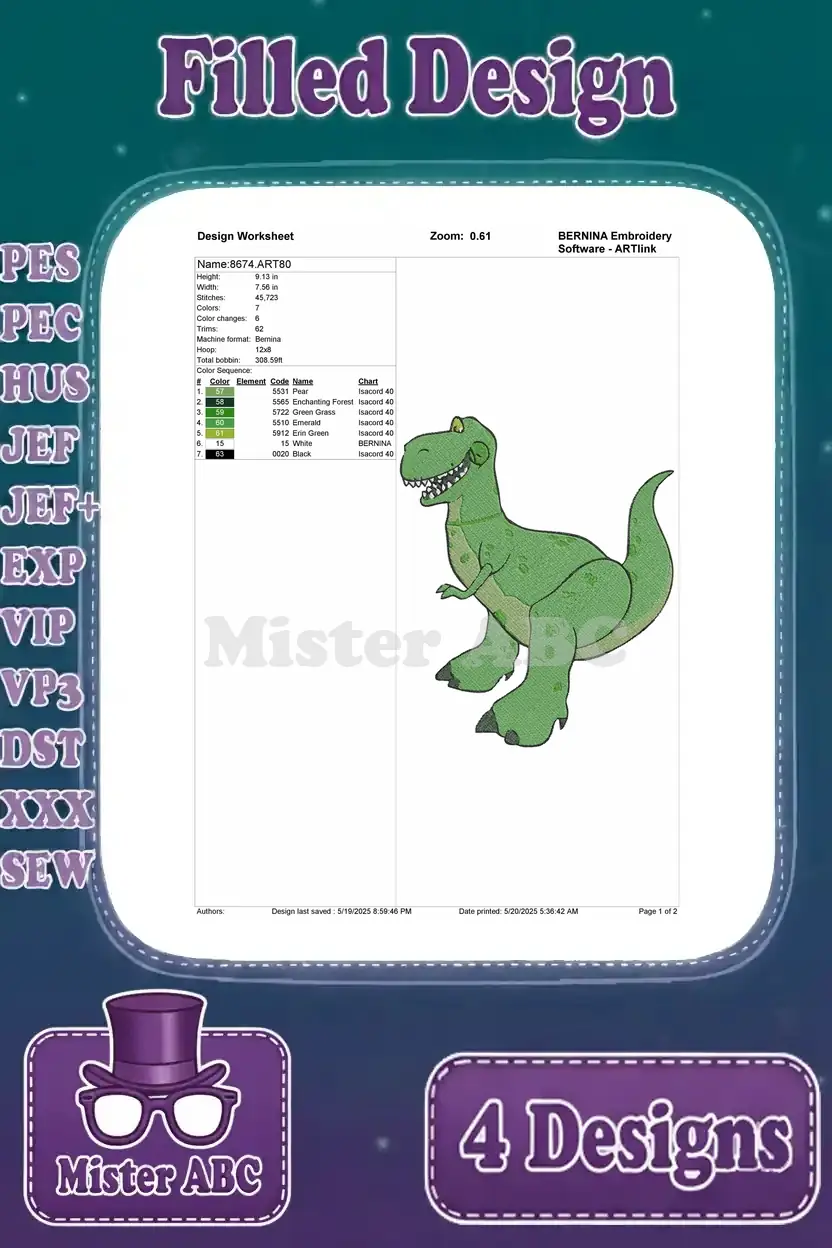 Disney Pixar Toy Story Rex Dinosaur Scared Roaring With Monkey In Cone Set – Filled Embroidery Design