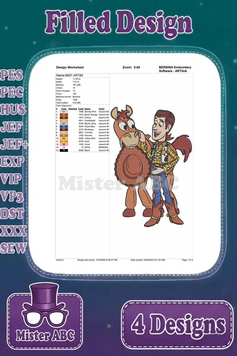 Disney Pixar Toy Story Woody Jessie Bo Peep Bullseye Horse Buzz Lightyear - Filled Embroidery Design - 8695