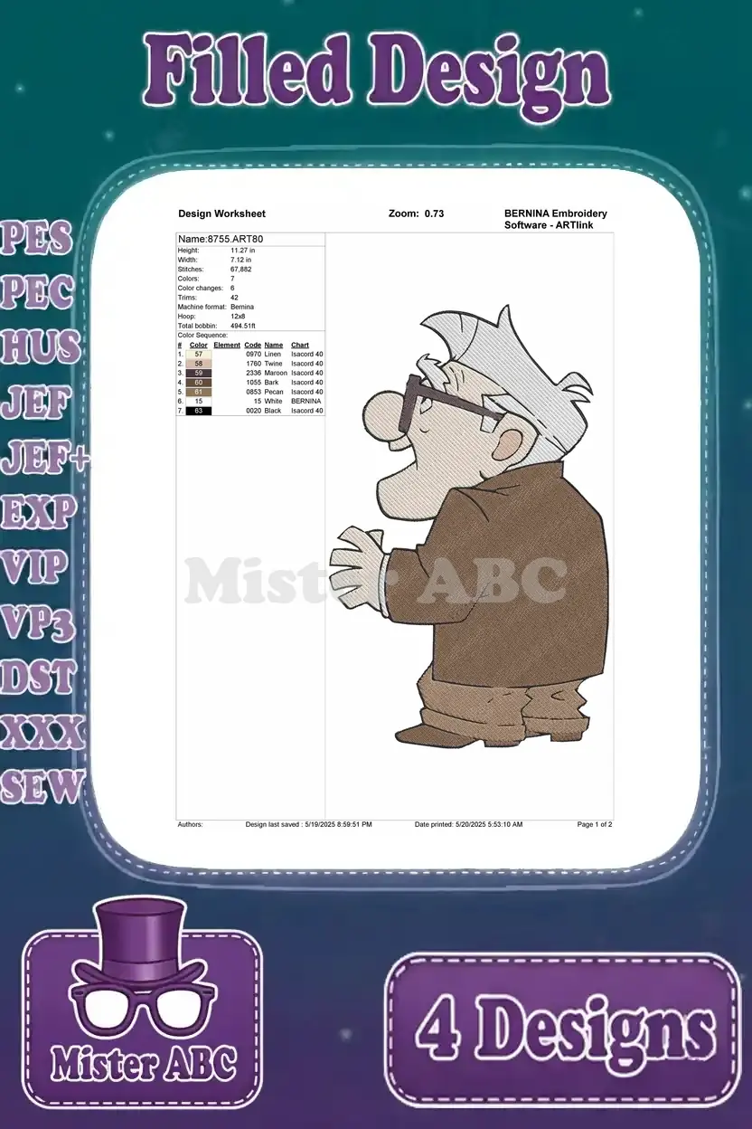 Disney Pixar Up Carl Fredricksen With Dug Dog Kevin Bird Adventure Characters Set – Filled Embroidery Design