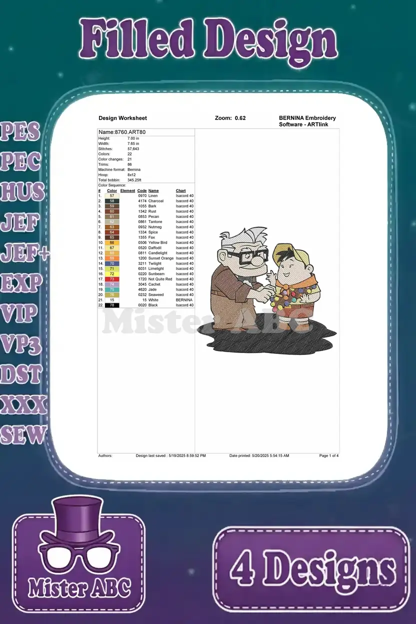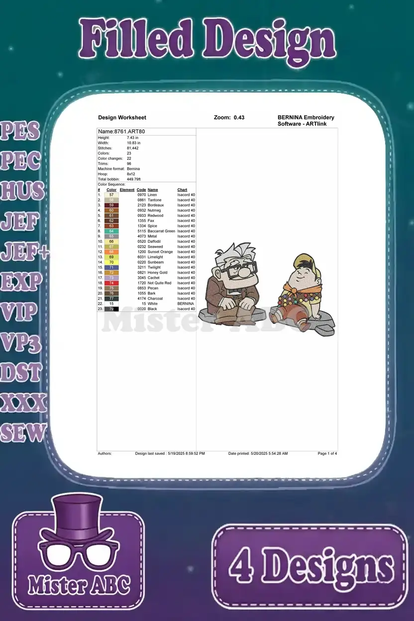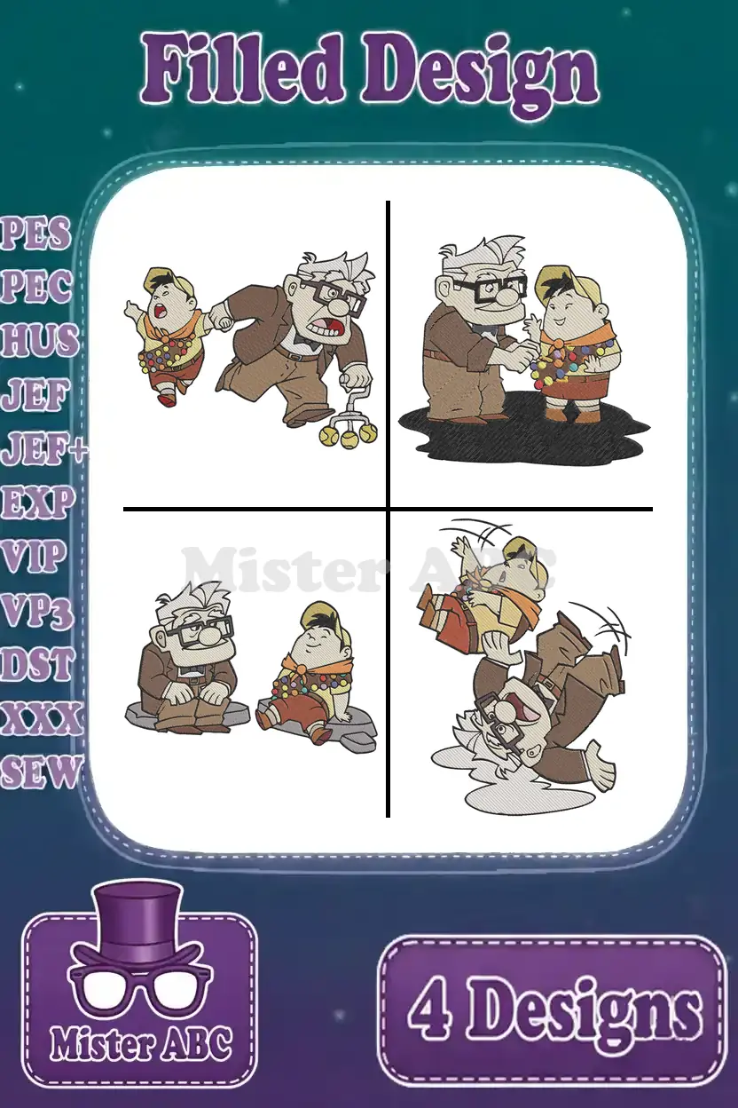 Bring the heartwarming adventure of Carl and Russell to life with this 4-design filled embroidery bundle. Perfect for fans!