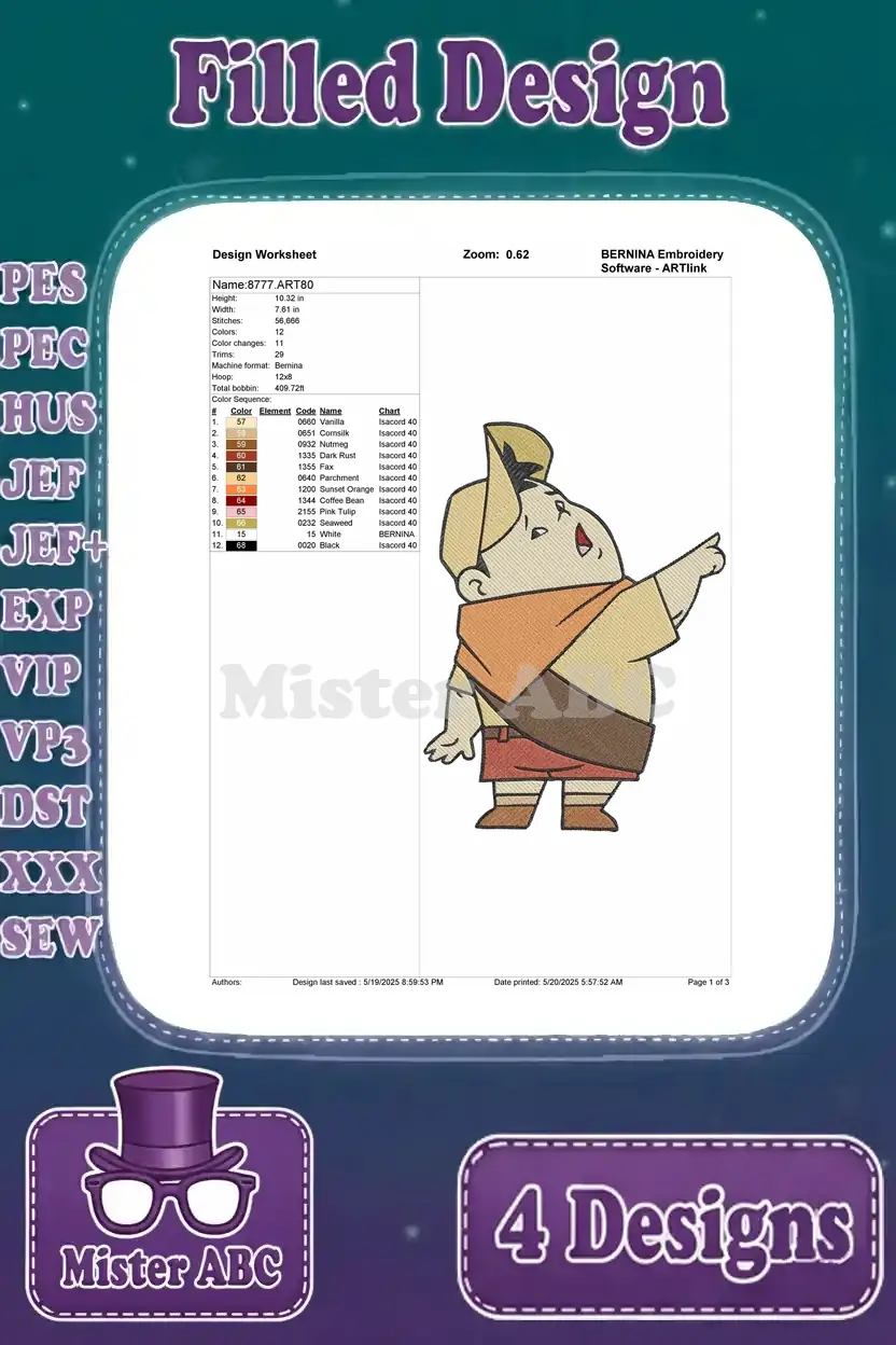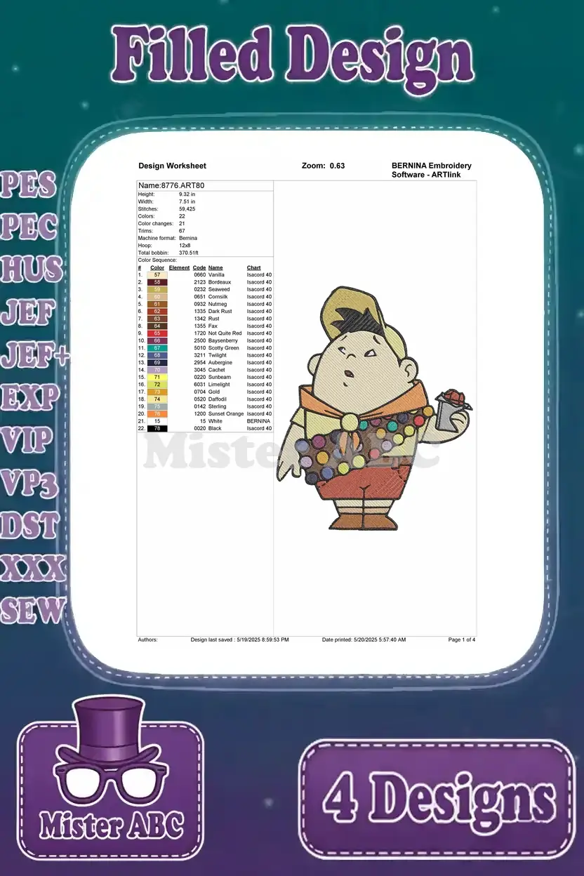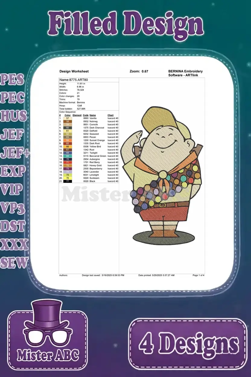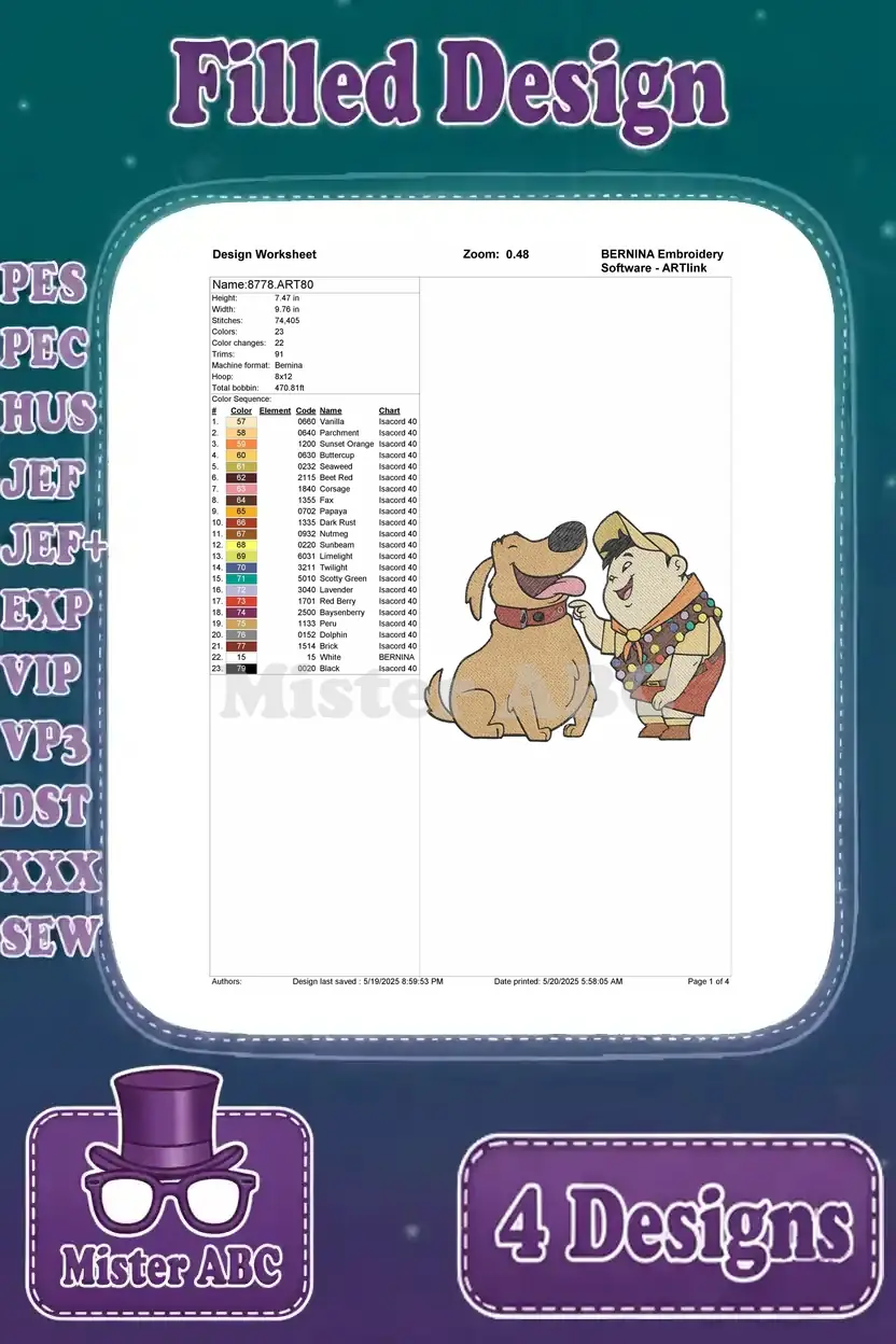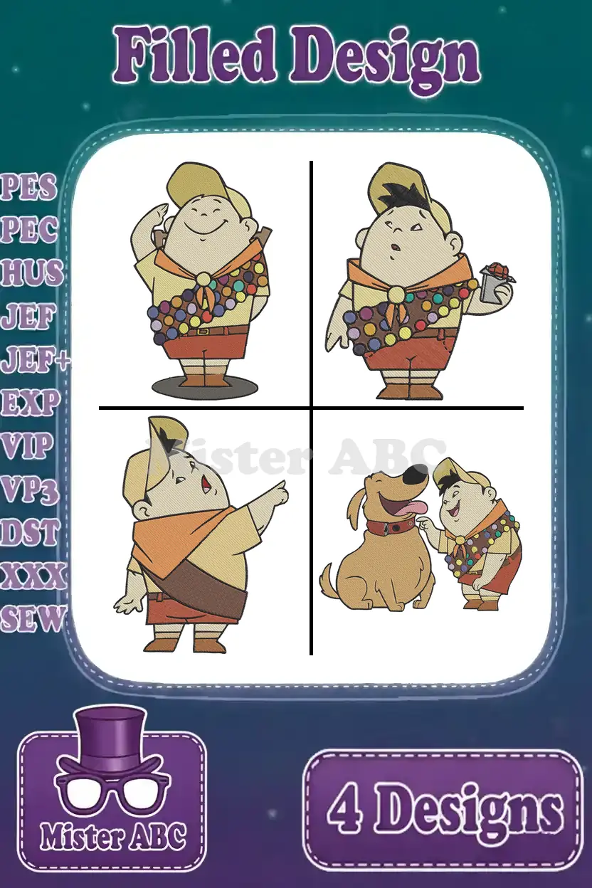Bring the adventurous spirit of Russell and Dug to life with this delightful 4-design embroidery bundle! Perfect for fans of animated classics.