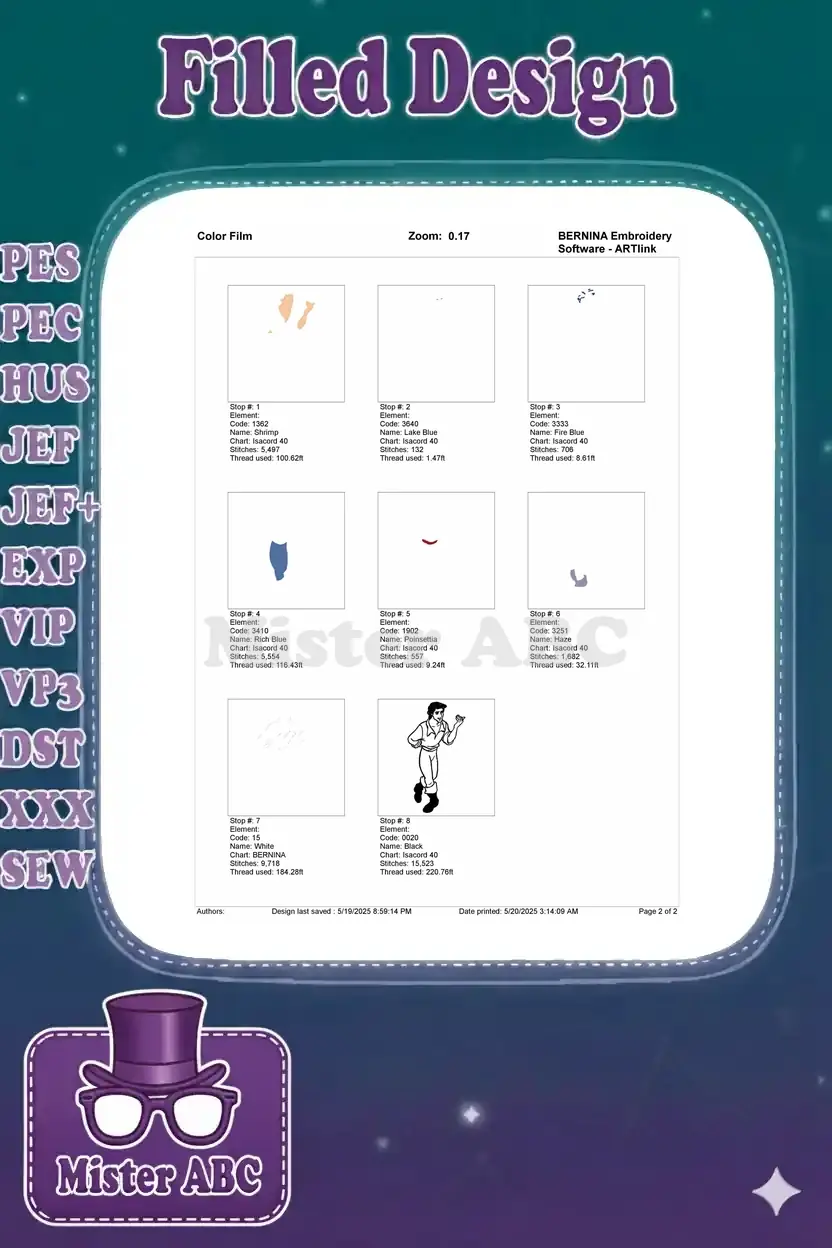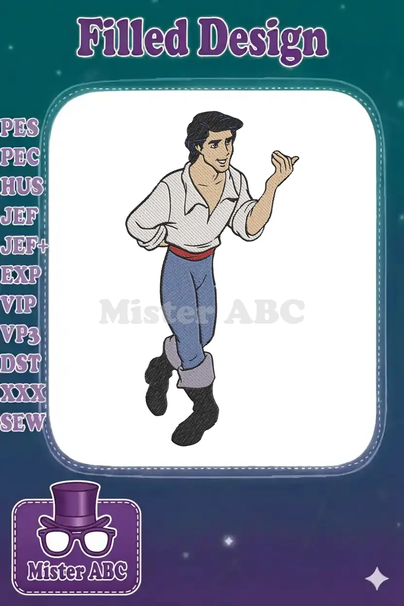 Bring the classic charm of Prince Eric to life with this detailed embroidery design, perfect for Disney fans and craft projects.