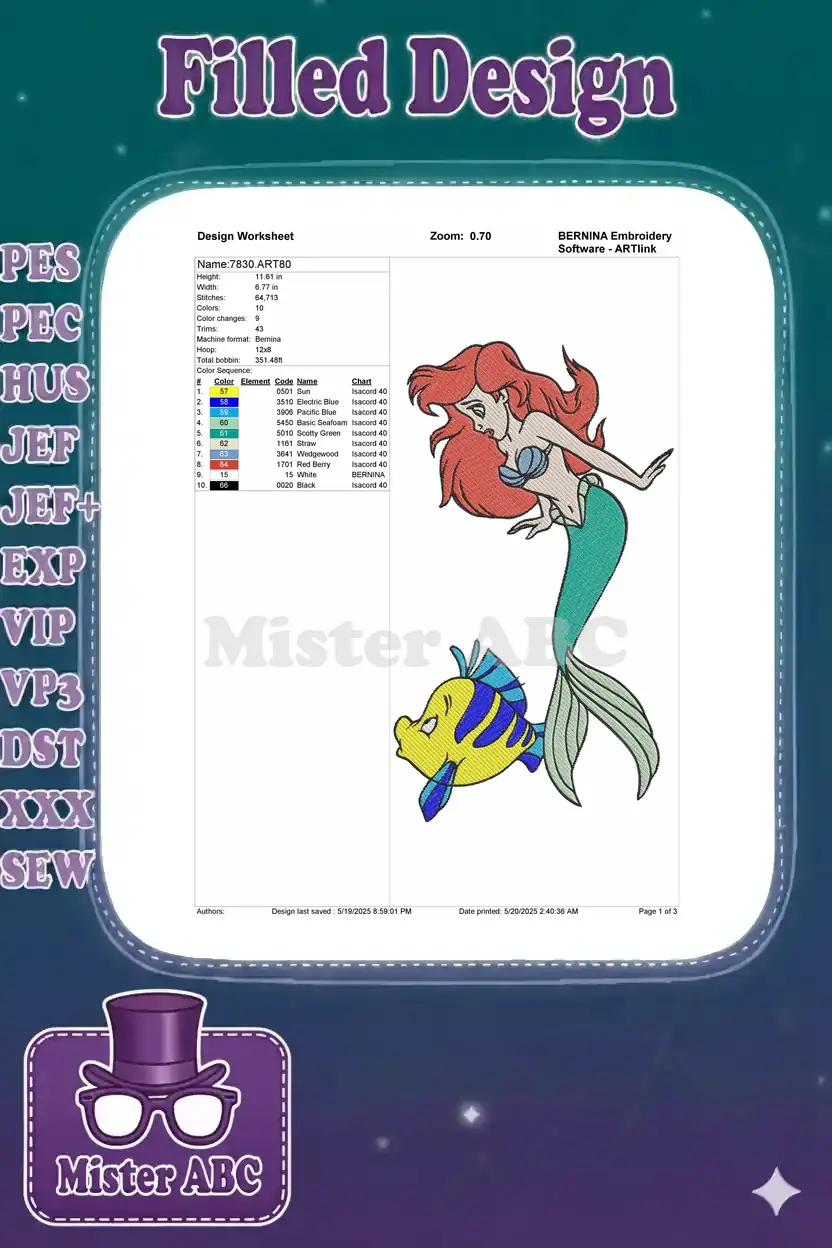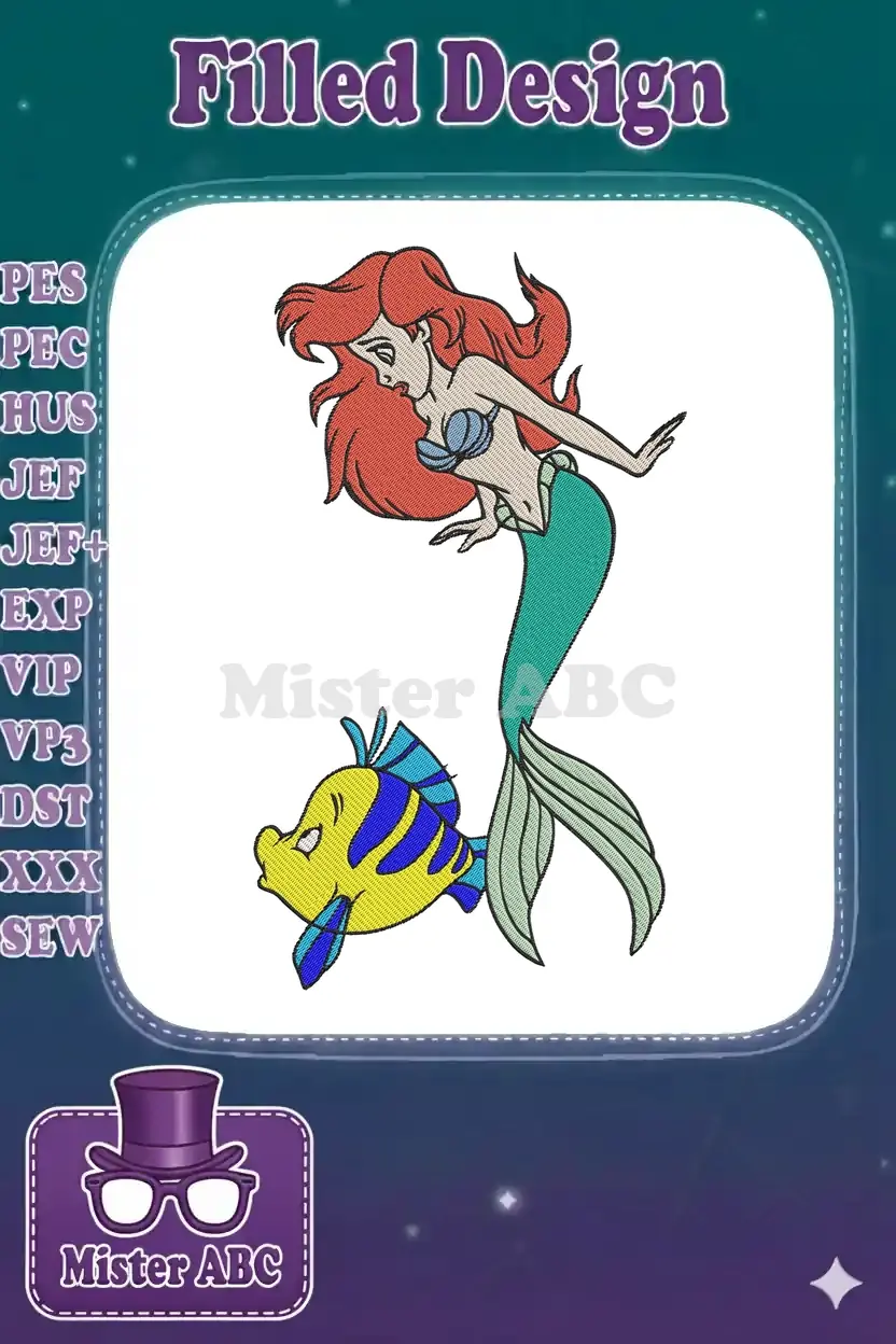 Dive into an enchanting underwater world with this vibrant embroidery featuring Ariel and her best friend Flounder. Perfect for fans!