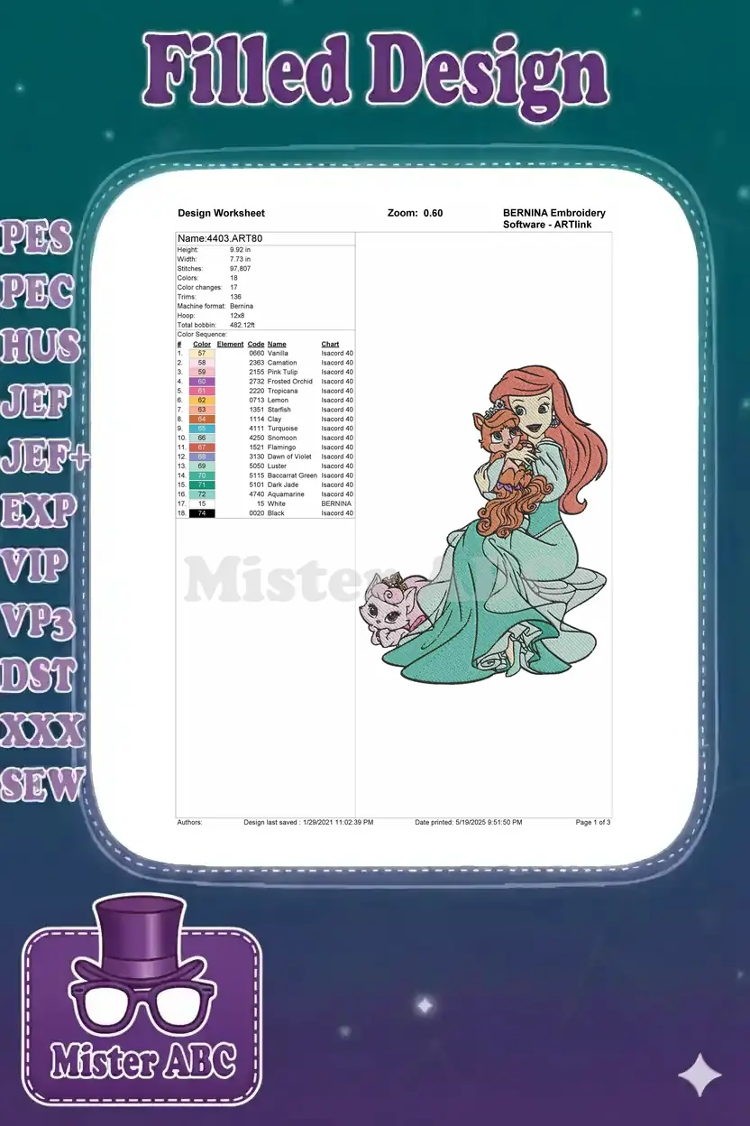Disney Princess Ariel and her adorable royal pets embroidery designs