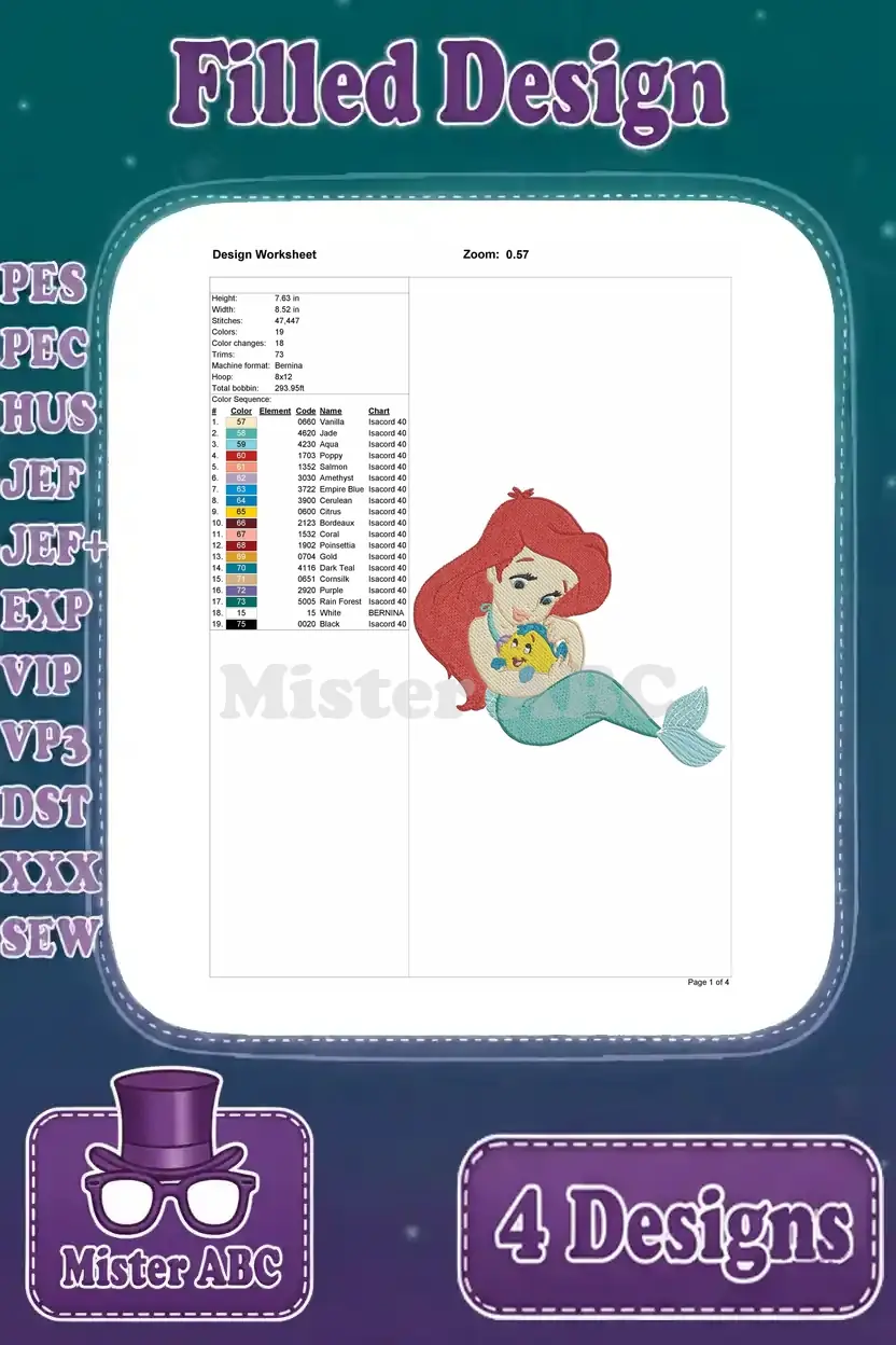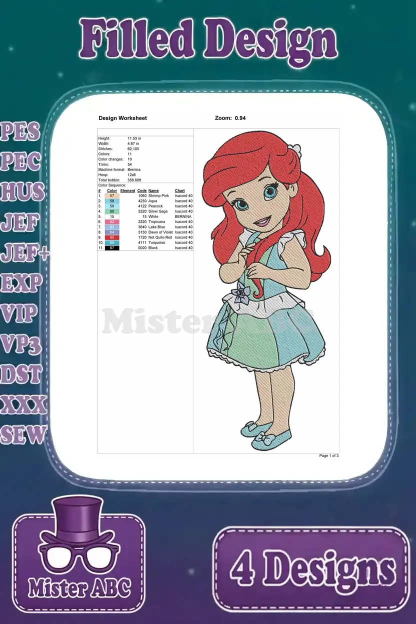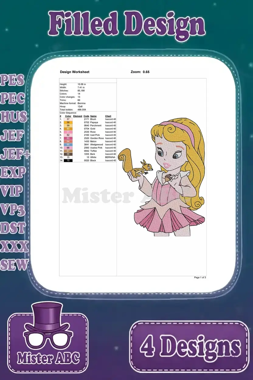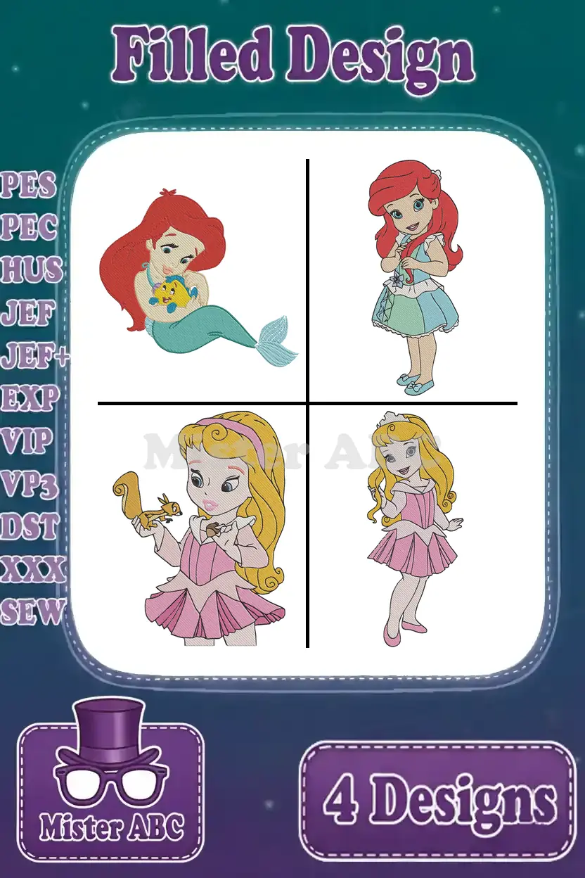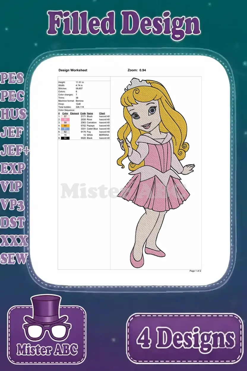 Disney Princess Ariel Mermaid Aurora Sleeping Beauty Pink Dress Classic Heroines – Filled Embroidery Design