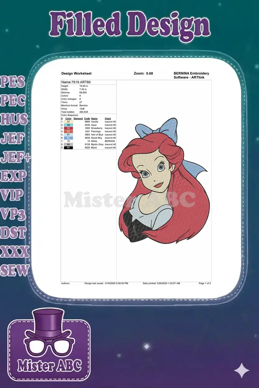 Disney Princess Ariel Red Hair Blue Bow Embroidery Designs