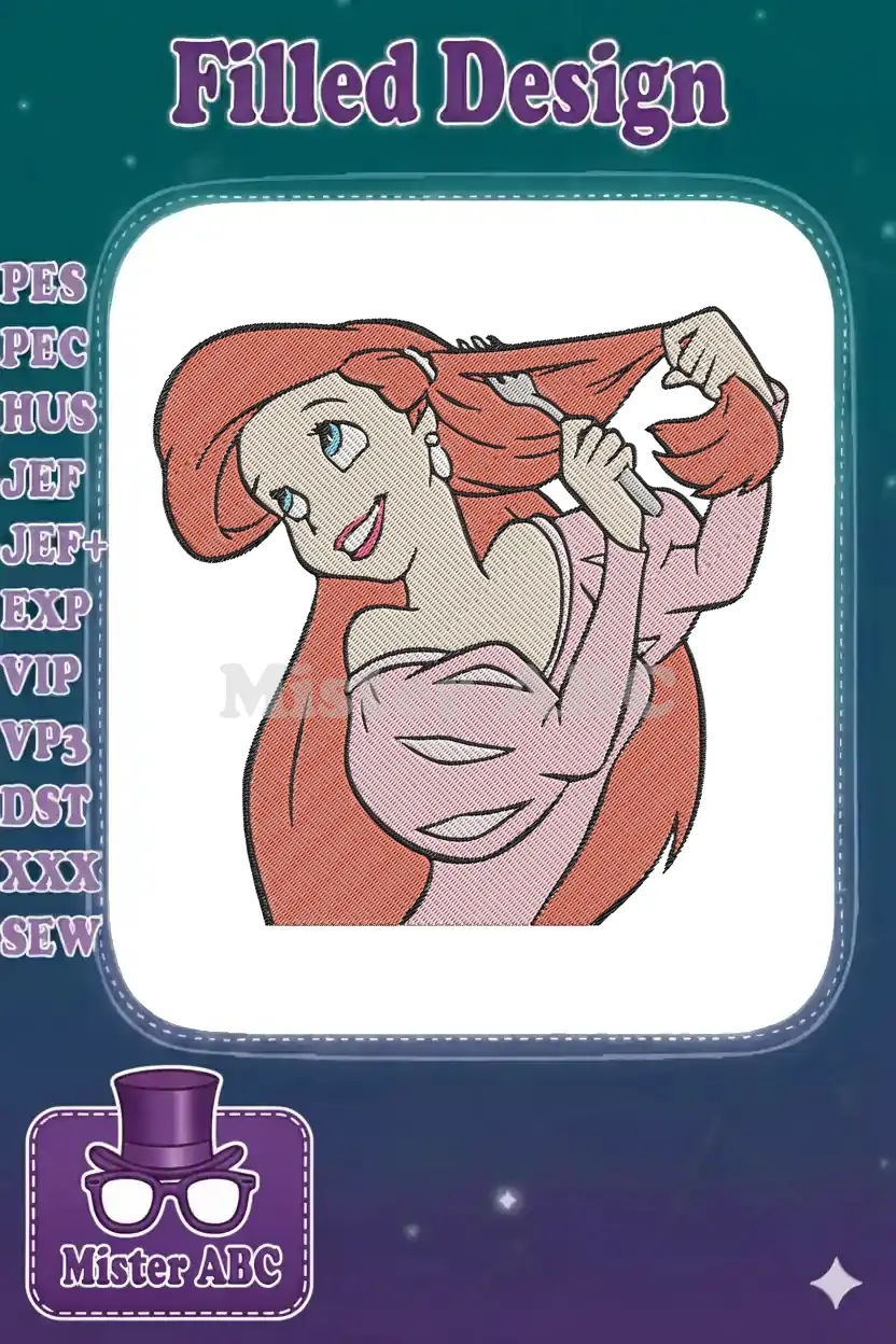 Disney Princess Ariel red hair combing with fork embroidery designs
