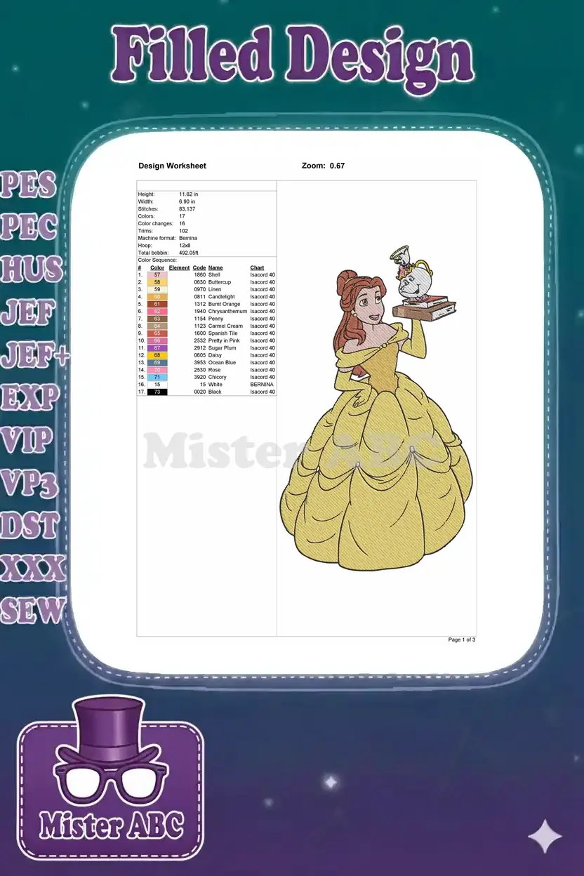 Bring enchanting Disney magic to life with this elegant Belle embroidery design, featuring Mrs. Potts and Chip, perfect for any project.