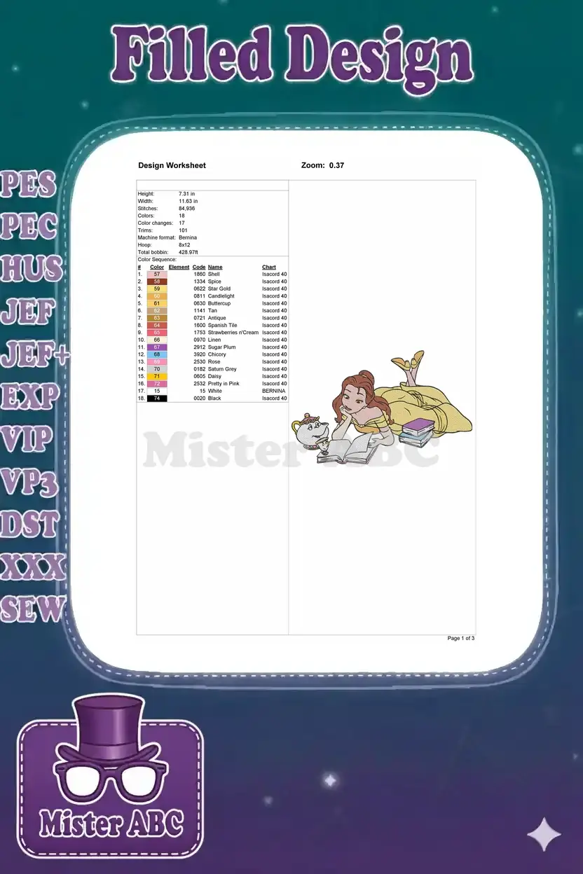 Disney Princess Belle with Mrs Potts and Chip Reading Embroidery Designs