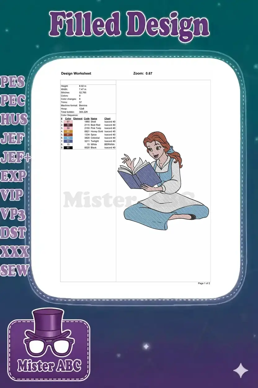 Disney Princess Belle Reading Book Classic Character Embroidery Designs