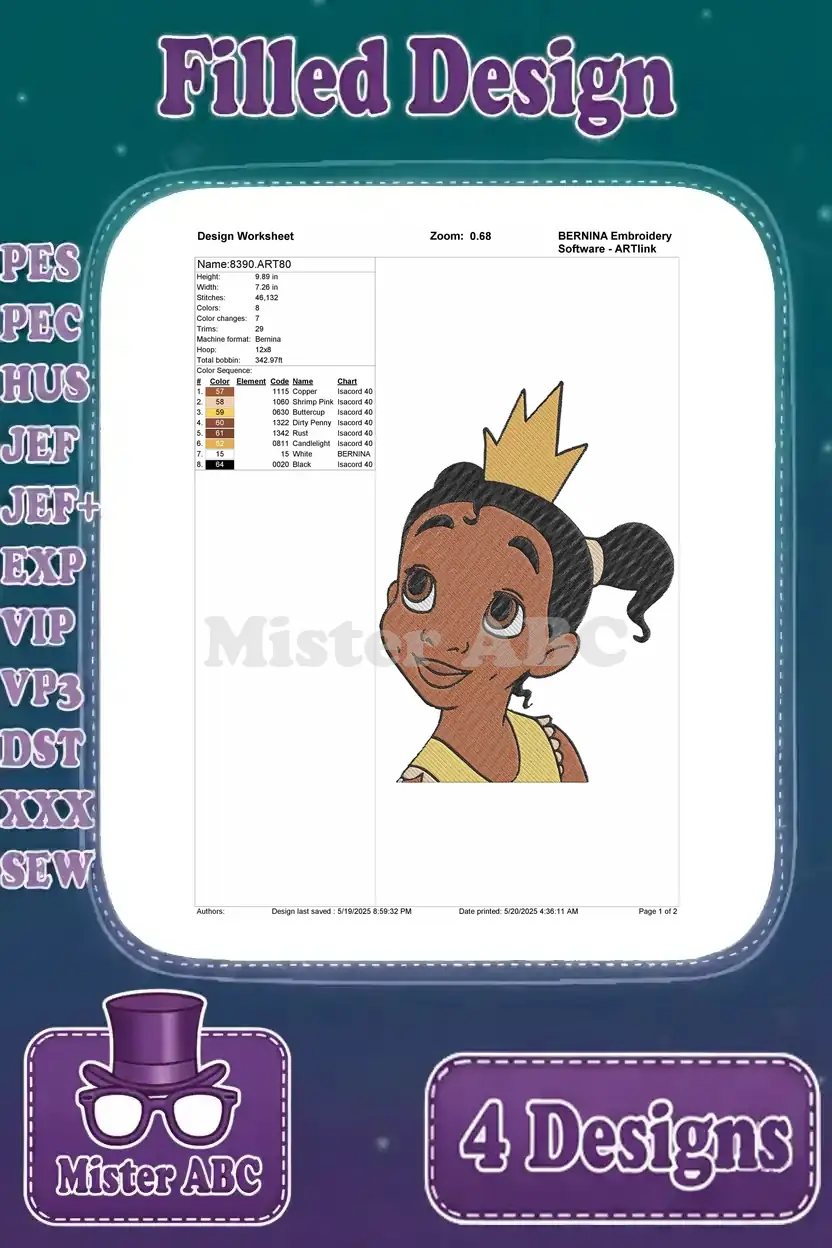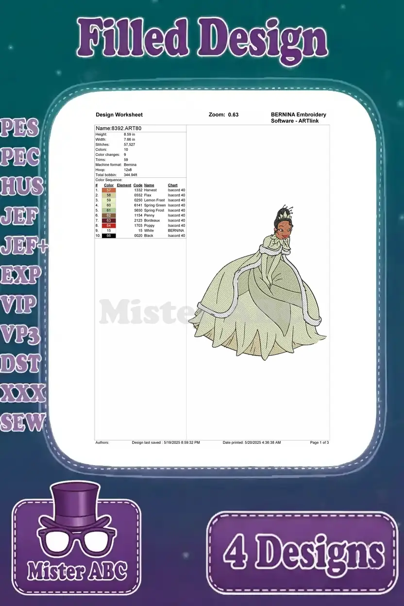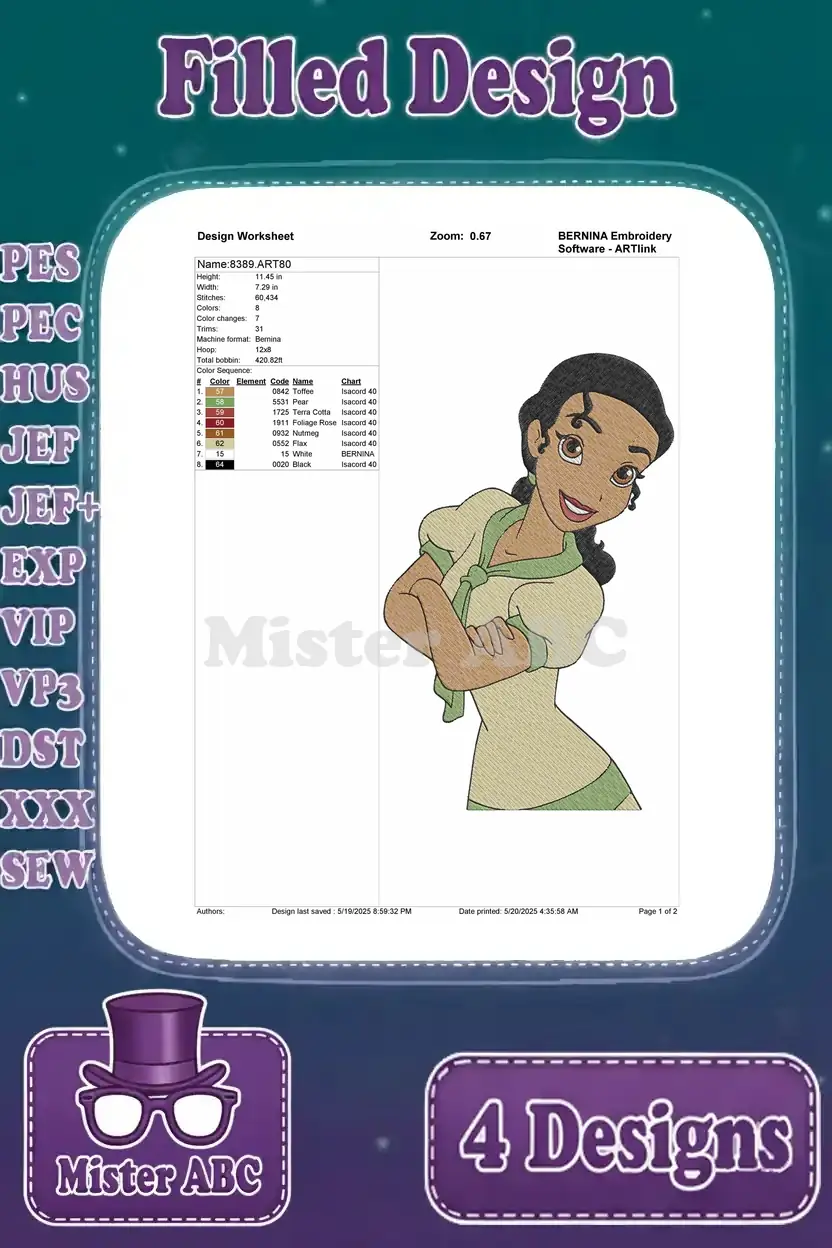 Disney Princess And Frog Tiana Working Close Up Portrait Green Gown Dreamer Set – Filled Embroidery Design