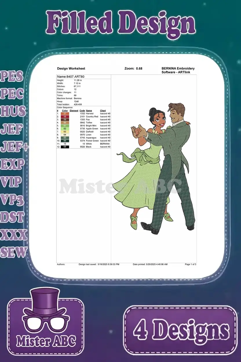 Disney Princess And Frog Tiana And Naveen Dancing Human Form Romance Designs – Filled Embroidery Design