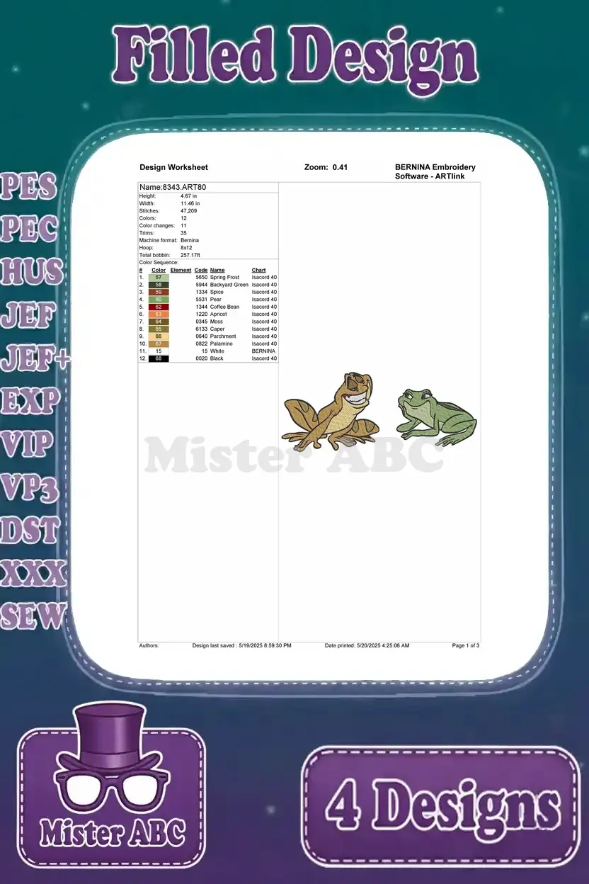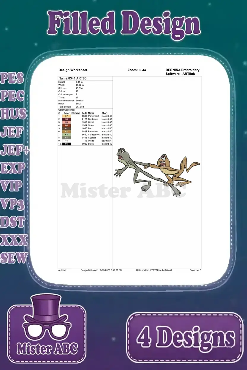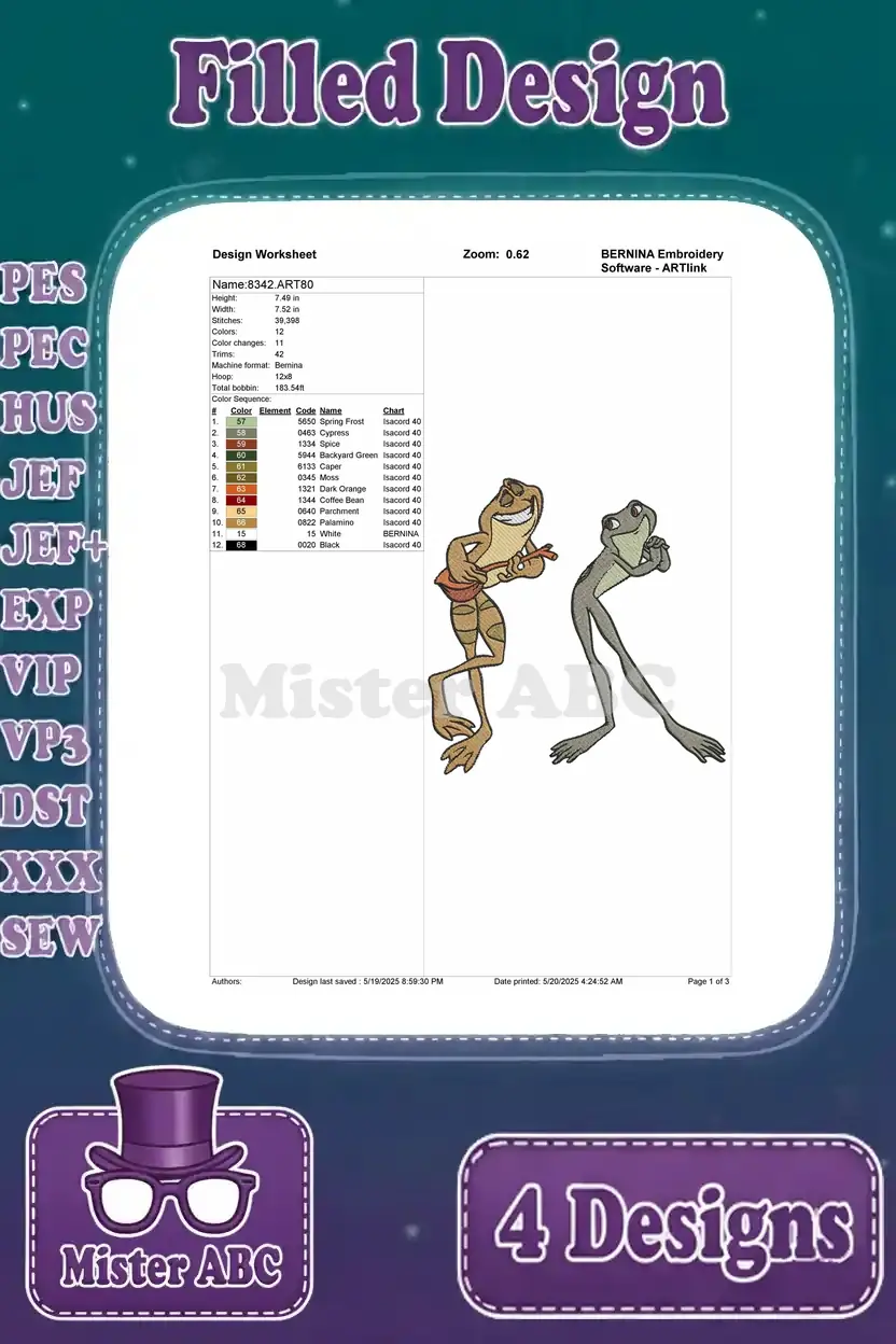 Disney Princess And Frog Tiana Naveen Frogs Louis Alligator Playing Trumpet – Filled Embroidery Design