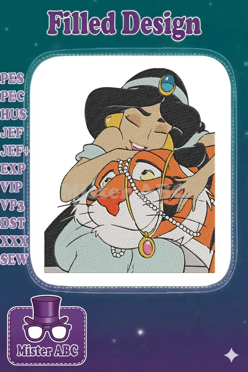 Disney Princess Jasmine and Rajah Tiger Hugging Embroidery Designs
