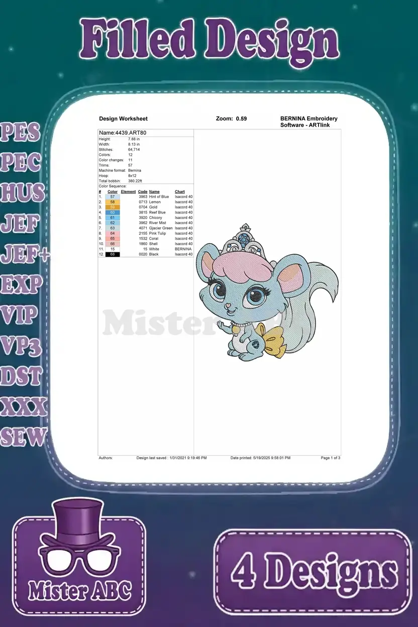Disney Princess Palace Pets Petite Pony Belle Windflower Raccoon Pocahontas Designs – Filled Embroidery Design