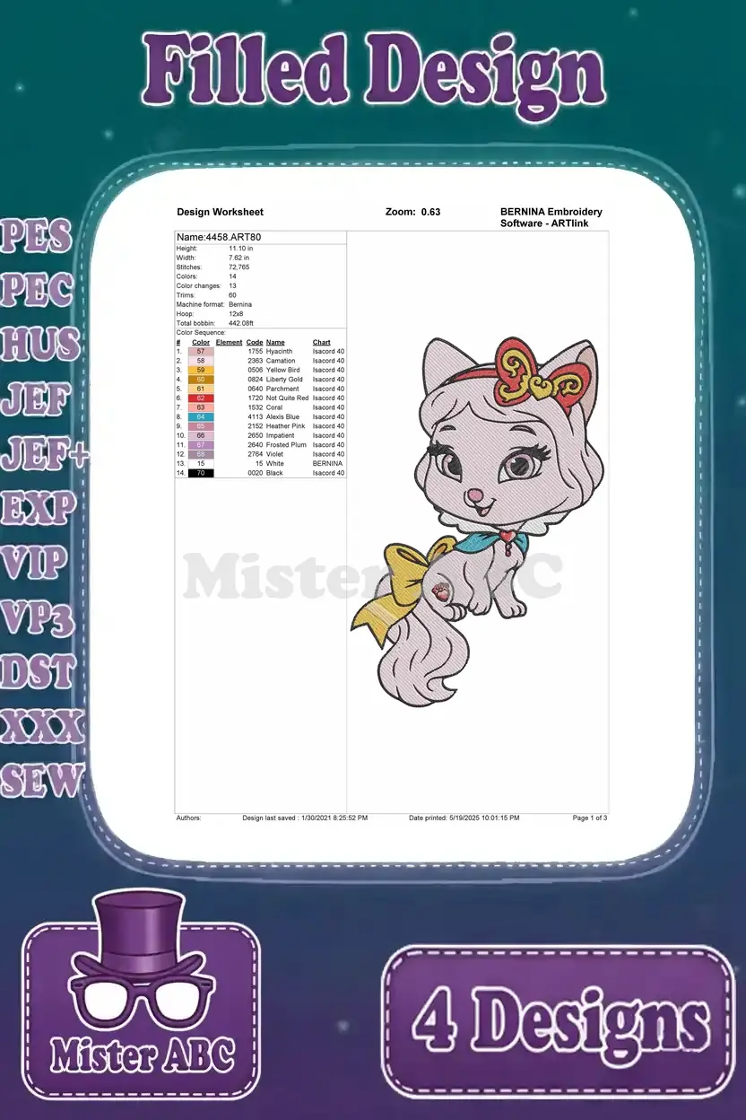 Disney Princess Palace Pets Jasmine Sultan Tiger Poodle Cat Various Royalty – Filled Embroidery Design