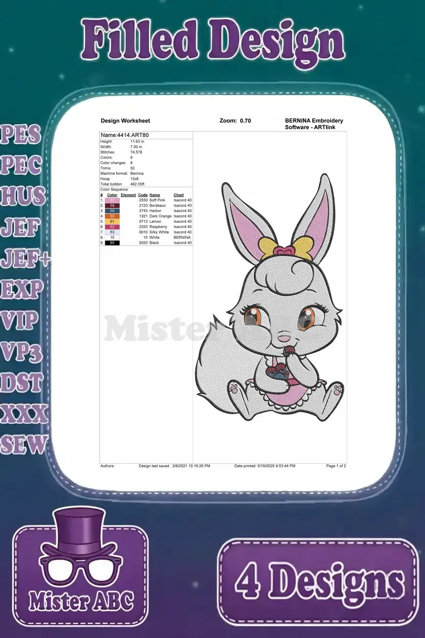 Disney Princess Palace Pets Berry Bunny Aurora Sleeping Beauty Cute White Rabbit – Filled Embroidery Design