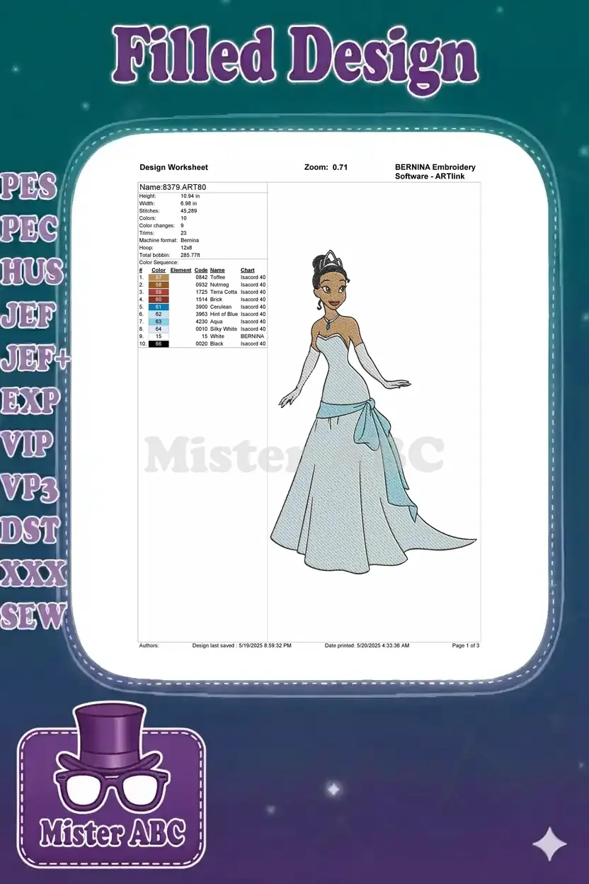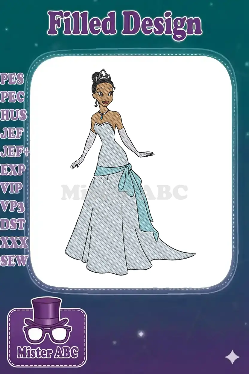 Disney Princess Tiana elegant blue ball gown embroidery designs