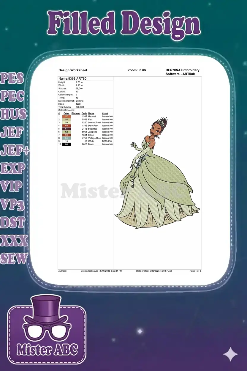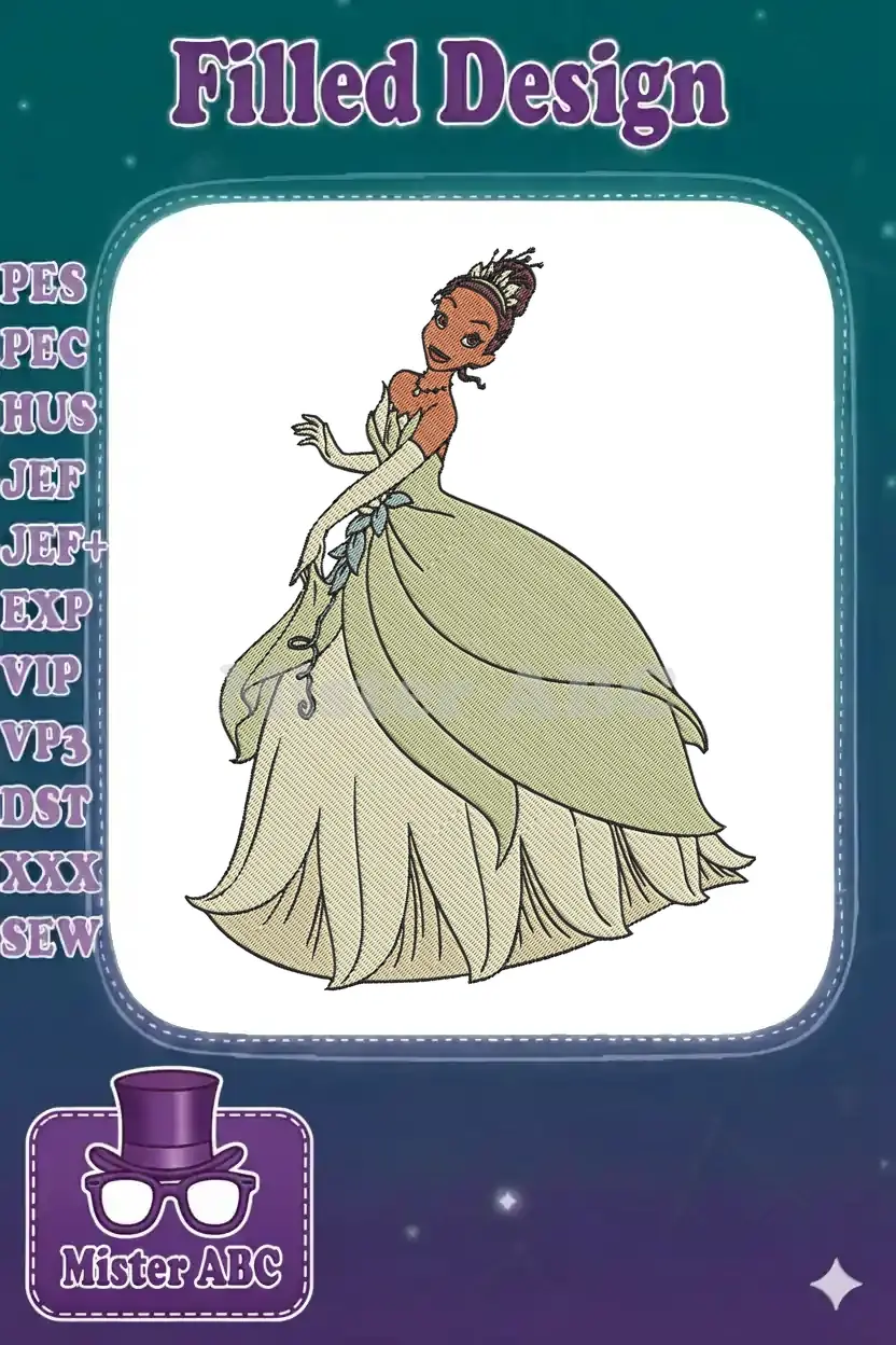 Disney Princess Tiana elegant green lily pad gown embroidery designs