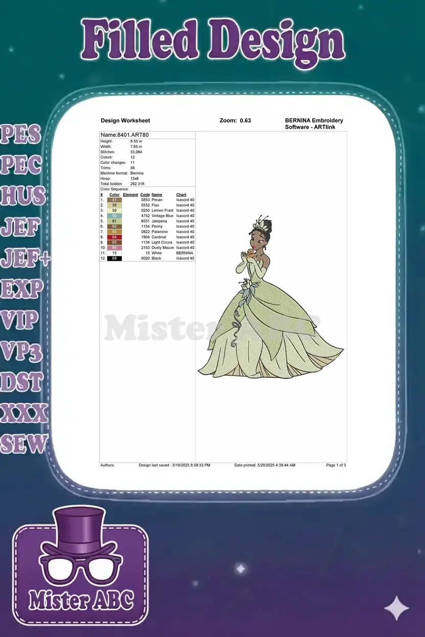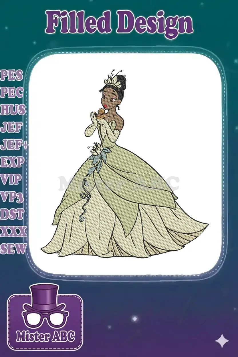 Disney Princess Tiana with Frog Green Gown embroidery designs