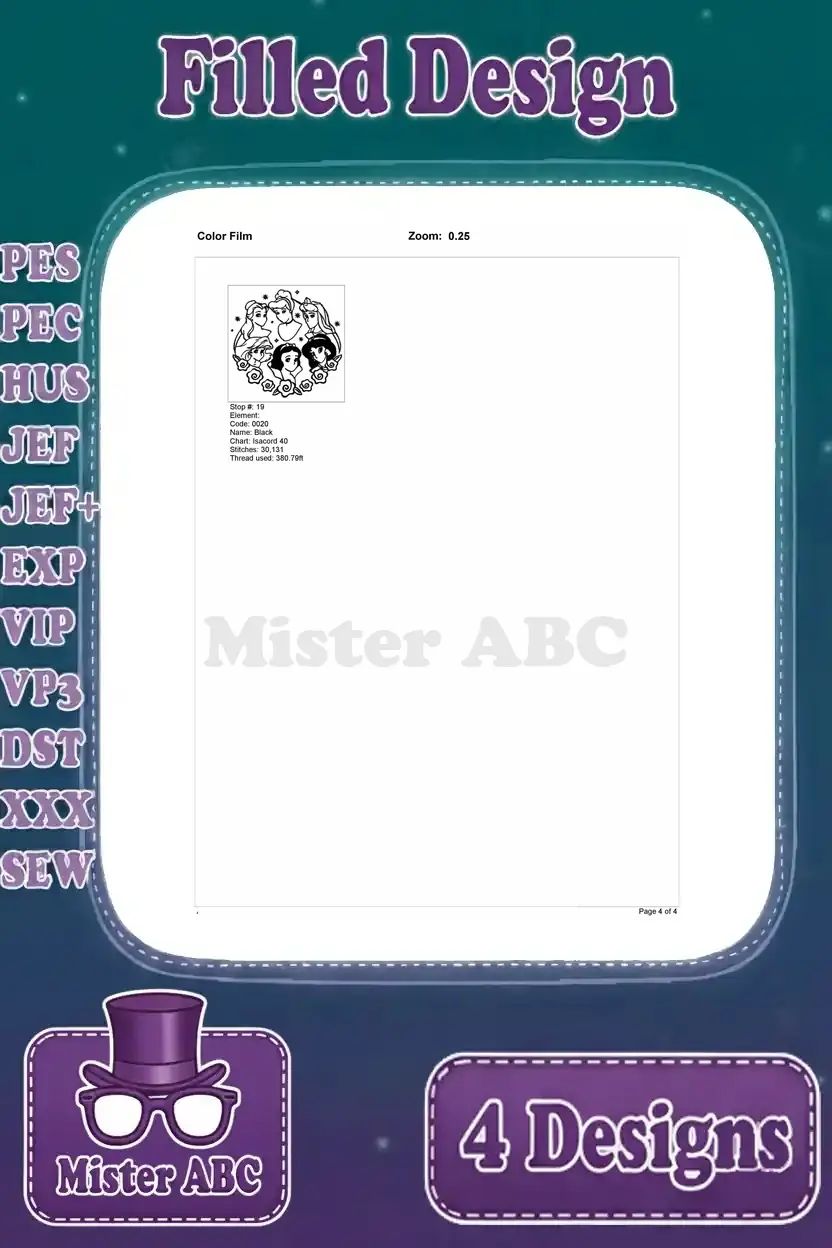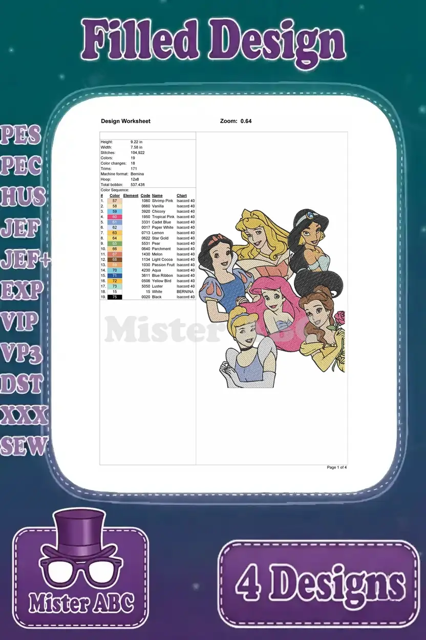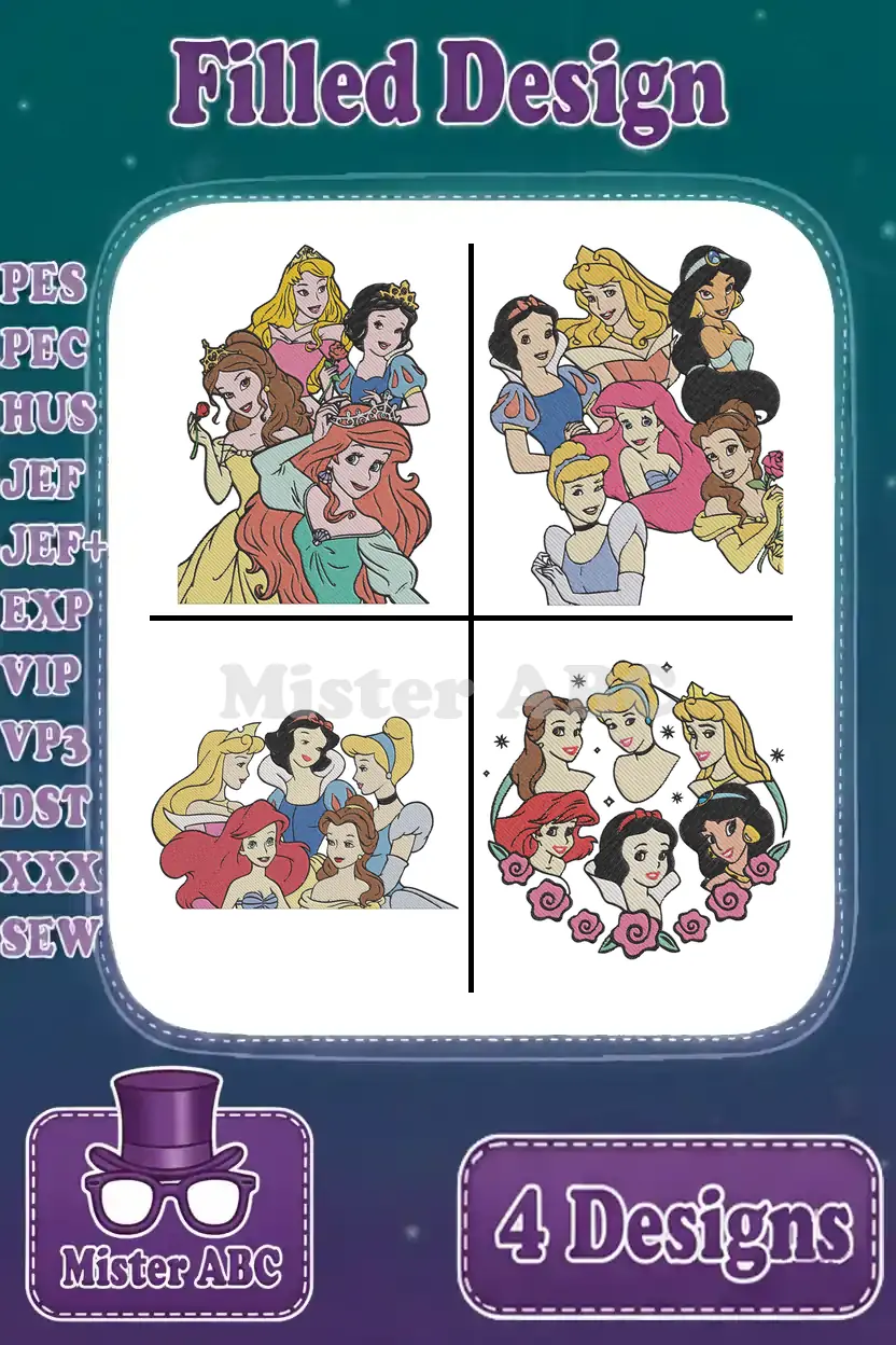 Enchanting Disney Princess embroidery bundle featuring four vibrant, filled designs. Perfect for adding magic to any project!