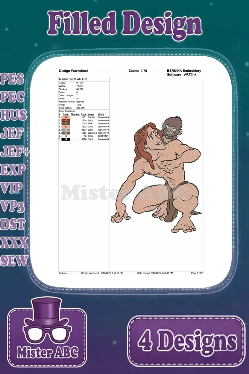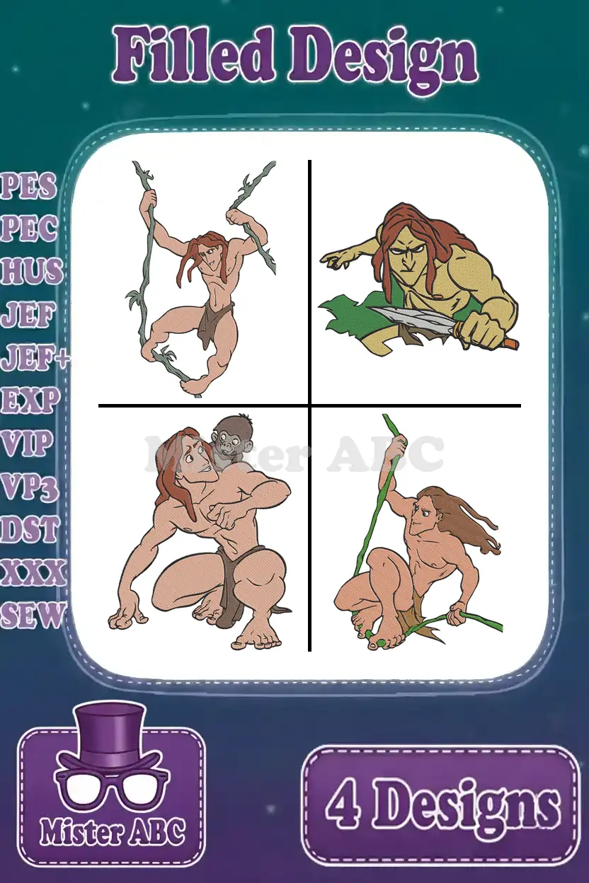 Disney Tarzan Swinging On Vines With Knife And Crouching Jungle Action Poses – Filled Embroidery Design