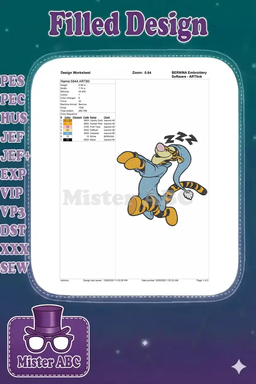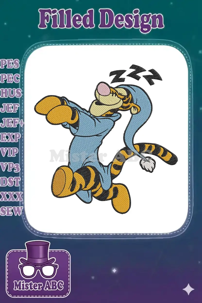 Embrace cozy dreams with this adorable Tigger embroidery design, perfect for adding whimsy to any project. A delightful sleepy Tigger in pajamas, ready for sweet dreams.