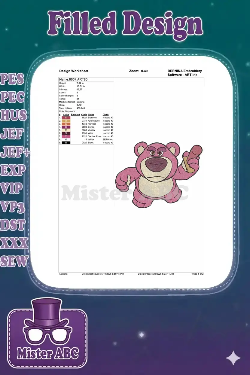 Disney Toy Story Lotso pink teddy bear mallet embroidery designs