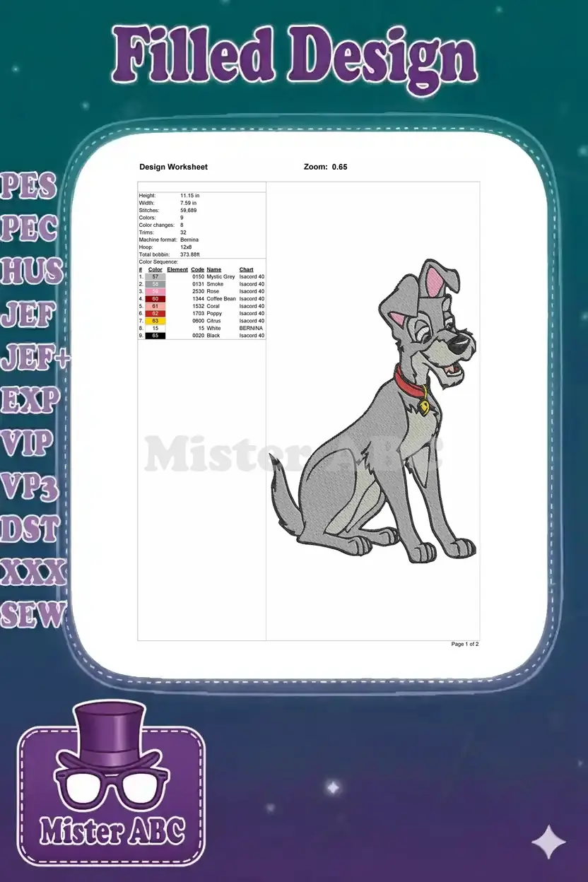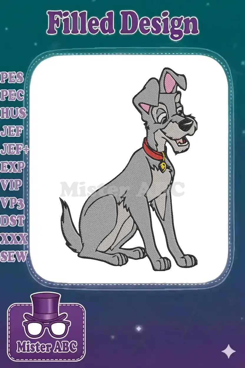 Disney Tramp grey dog sitting with red collar embroidery designs