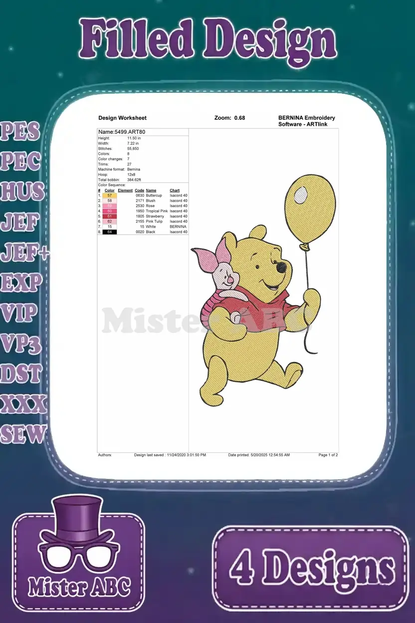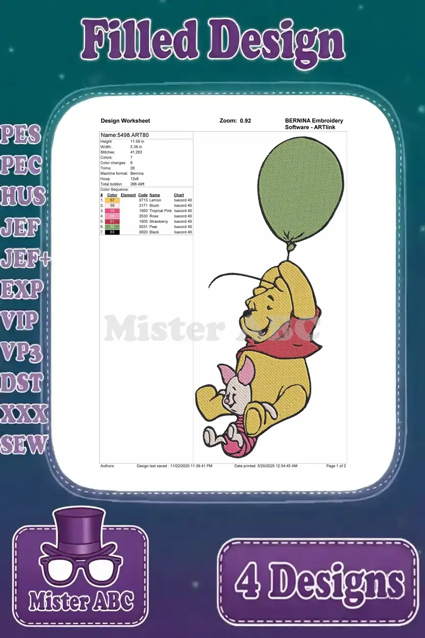Disney Winnie Pooh With Balloons Piglet Floating Joyful Playful Bear Pig – Filled Embroidery Design