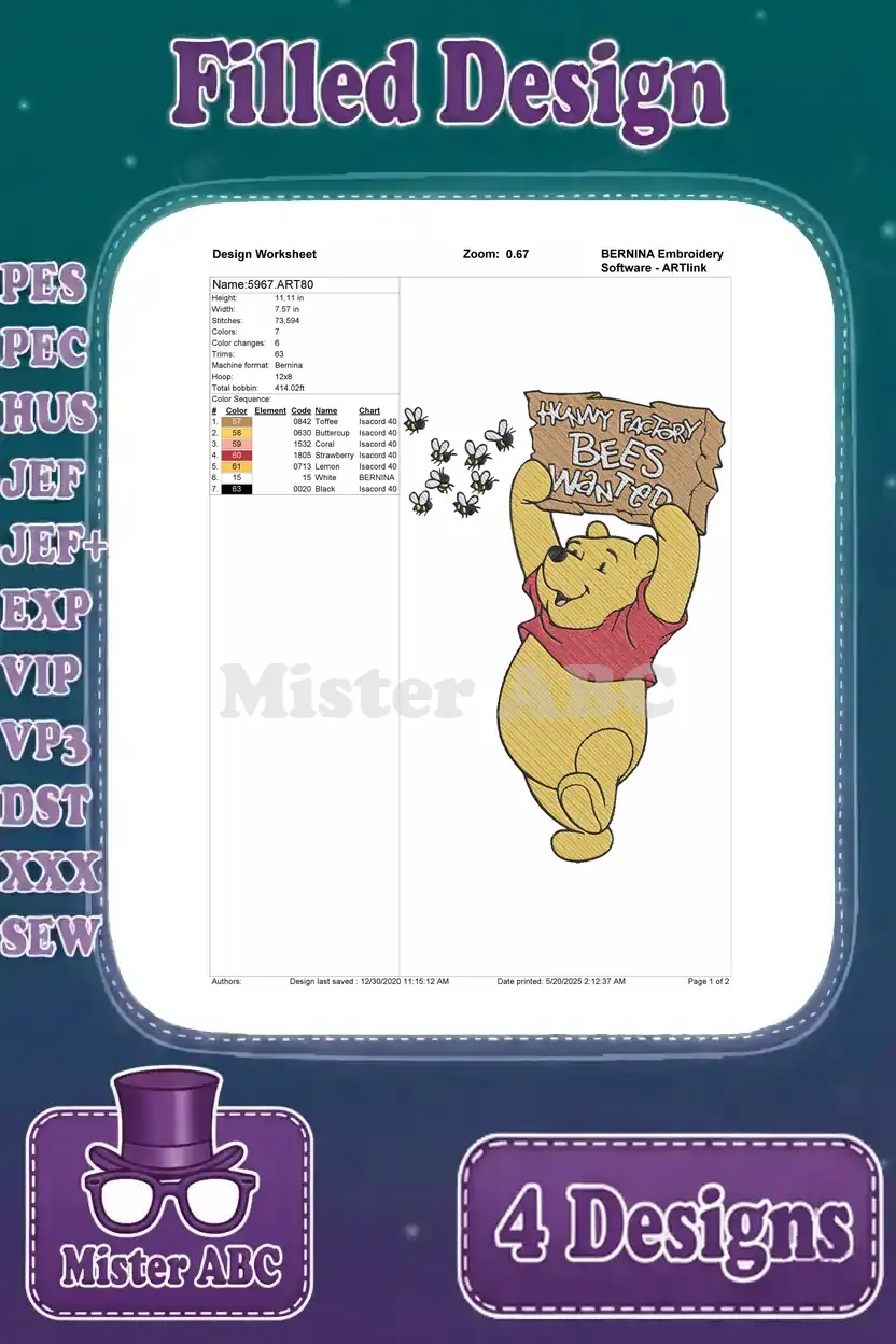 Disney Winnie Pooh Bear Honey Sign Upside Down Little Red Riding Hood Drinking – Filled Embroidery Design