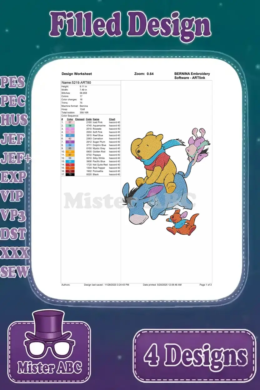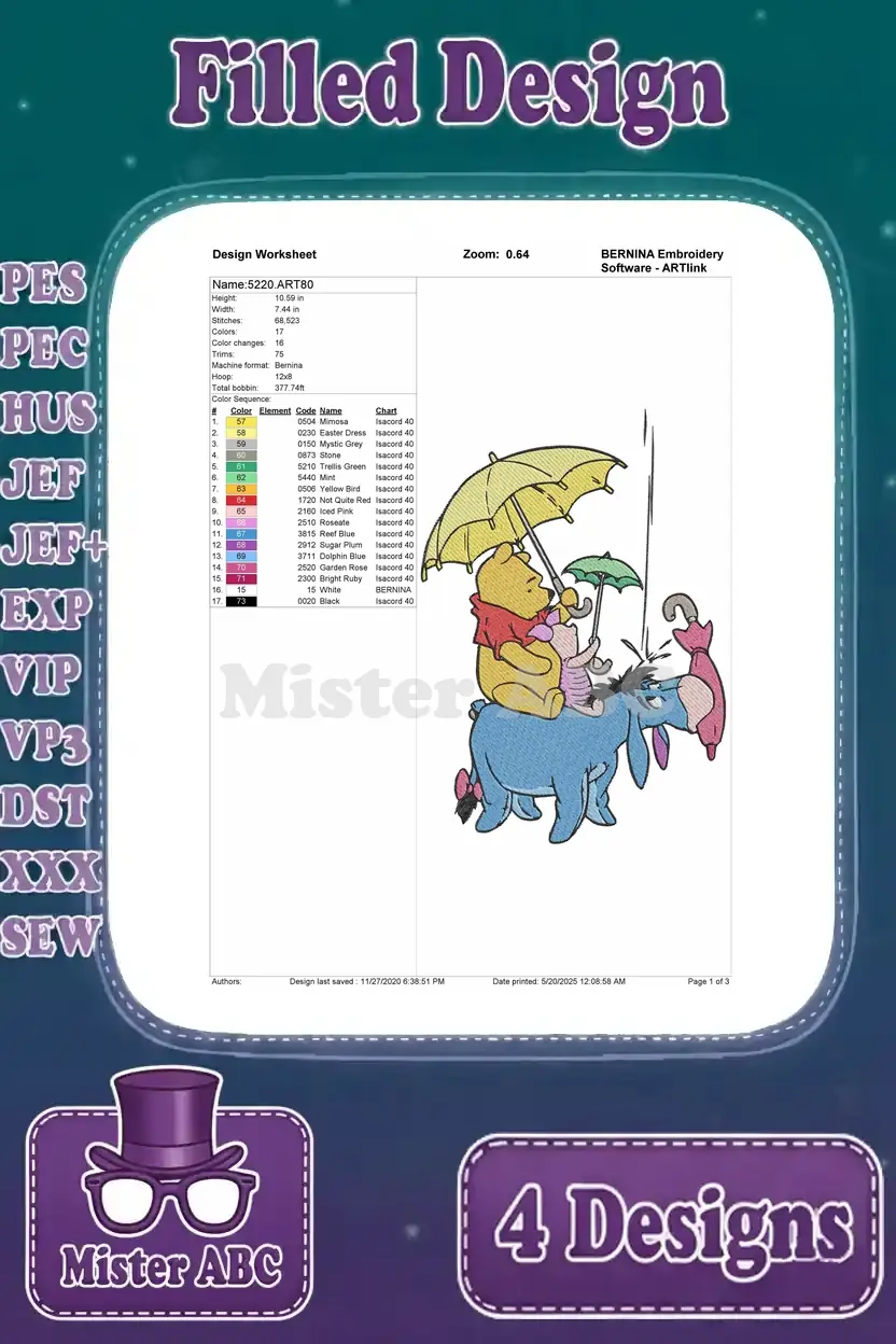 Disney Winnie Pooh And Friends Pooh Tigger Eeyore Piglet With Umbrella Group – Filled Embroidery Design