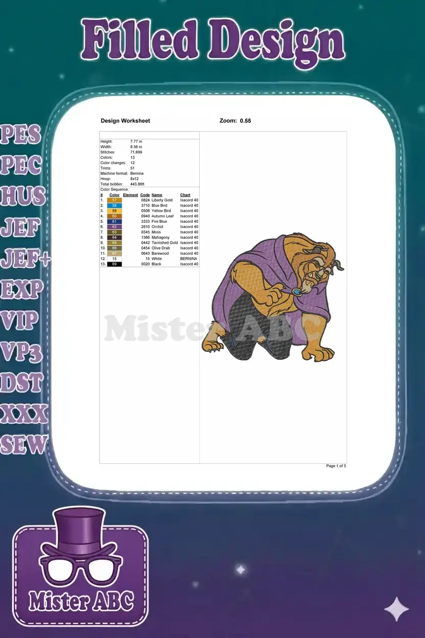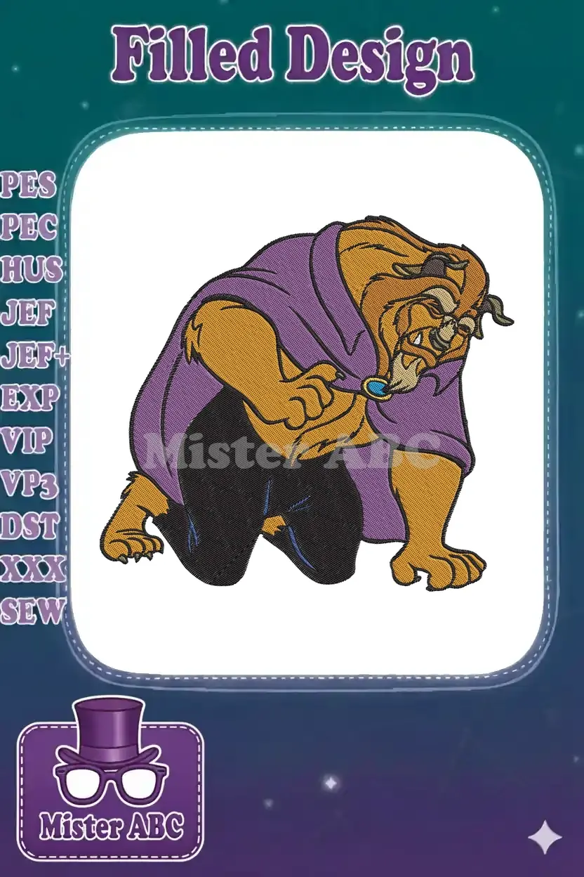 Captivating embroidery design features Disney’s Beast in his iconic purple cloak. A must-have for fans!