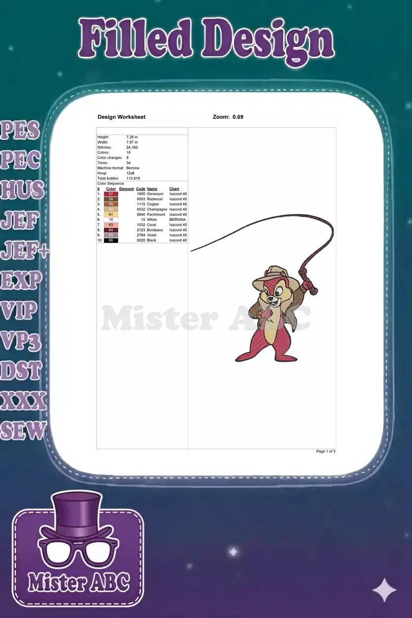 Disney’s Dale as Indiana Jones with whip embroidery designs