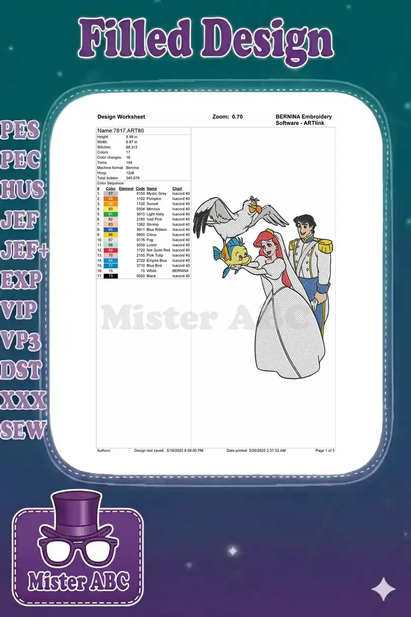 Celebrate love with this enchanting embroidery of Ariel and Prince Eric’s wedding, featuring Flounder and Scuttle. Perfect for Disney fans!