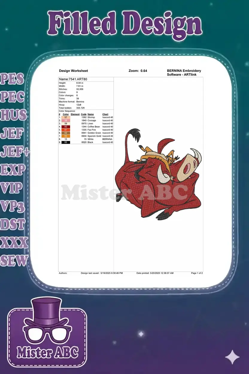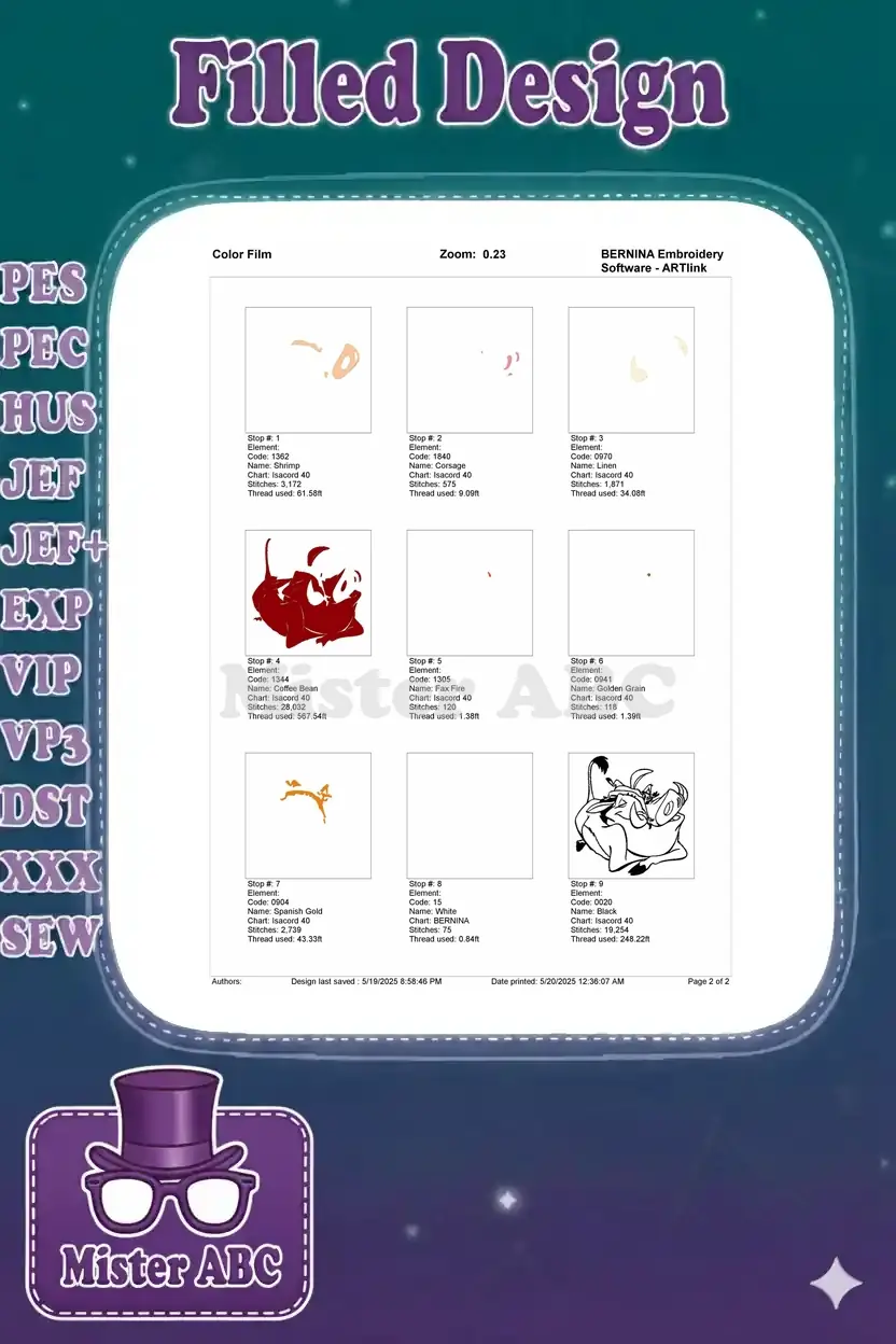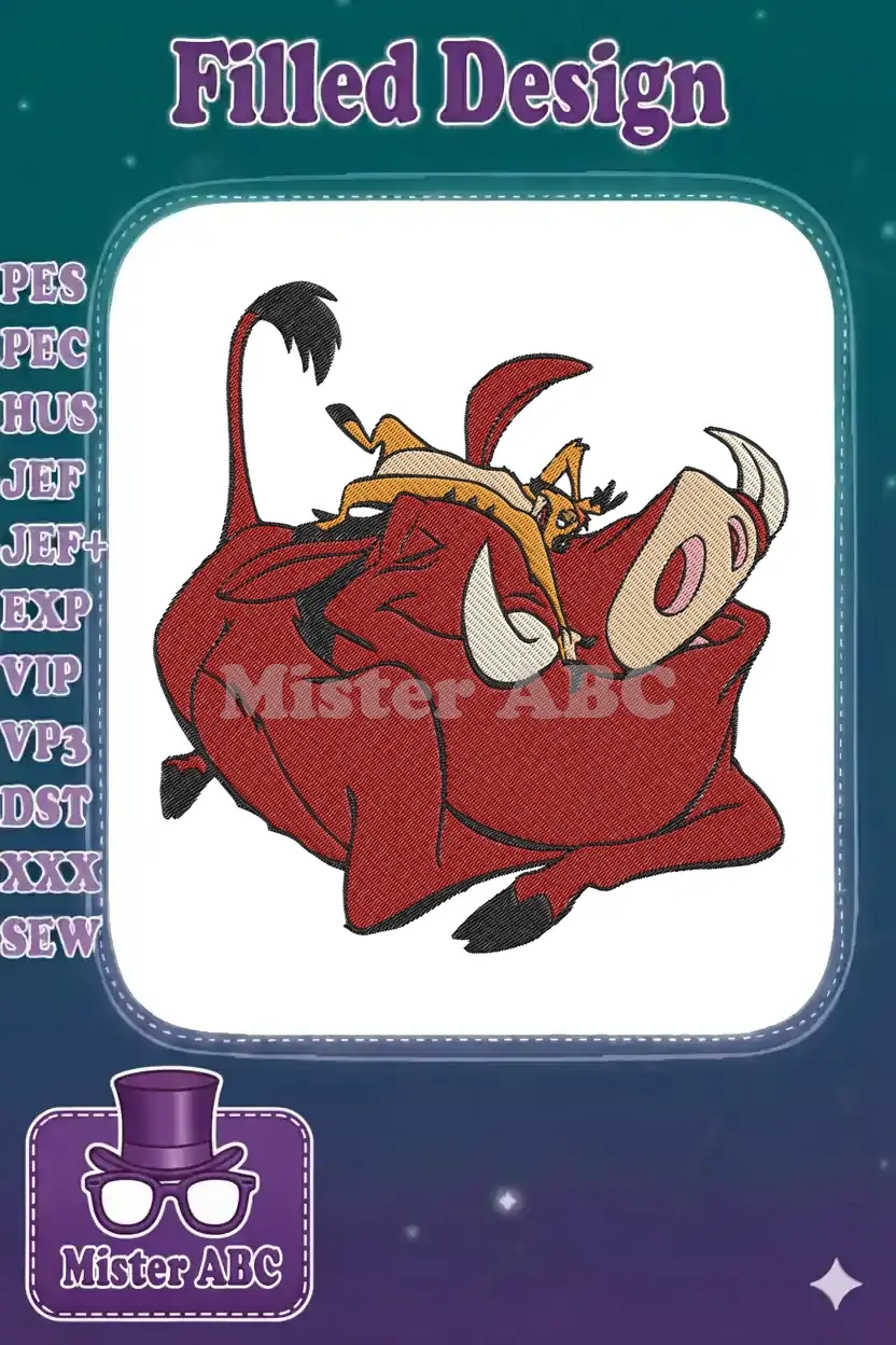 Disney’s Timon and Pumbaa riding Lion King character embroidery designs