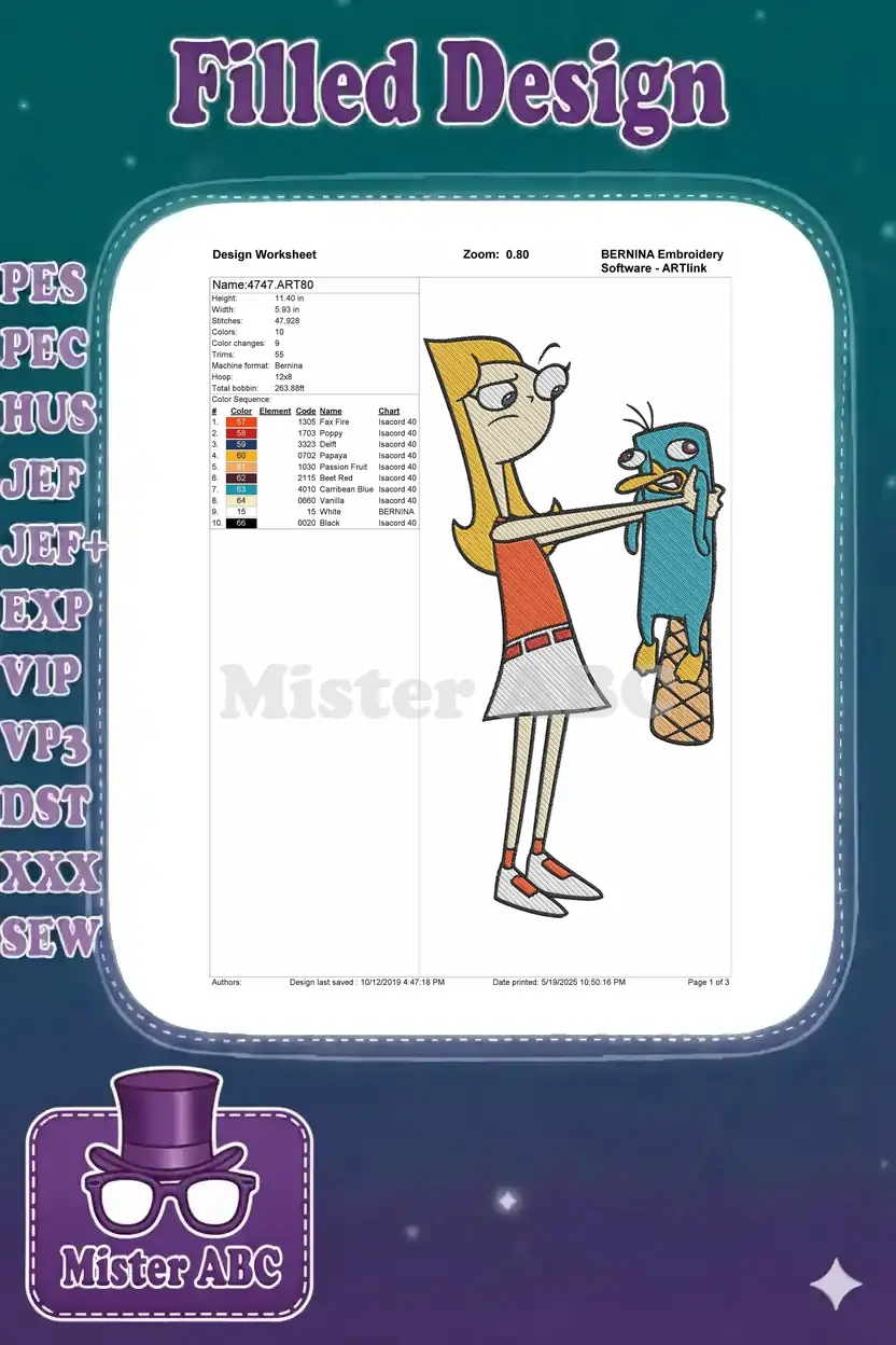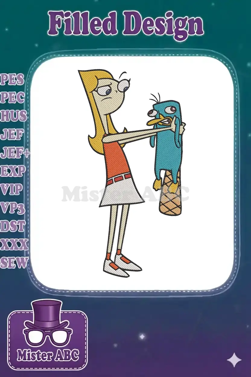 Distressed Candace Flynn holding Perry the Platypus cartoon embroidery designs